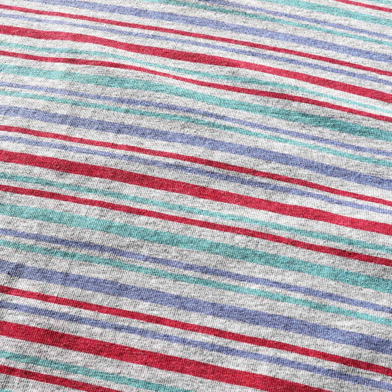 杢グレーベース、ブルー×レッド×ターコイズのプリントボーダー柄。