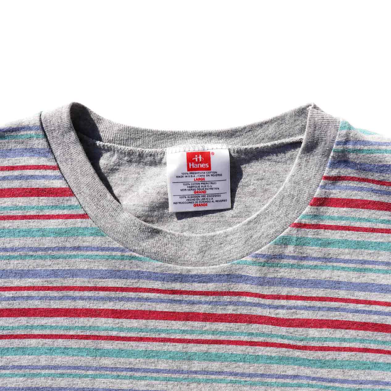 MODEL : HANES USA製 マルチ プリントボーダー Tシャツ MANUFACTURE : Made In U.S.A. AGE : 90's SIZE : L COLOR : 杢グレー MATERIAL : コットン 100% COMMENT : 90年代、ヘインズのボーダーTシャツです。