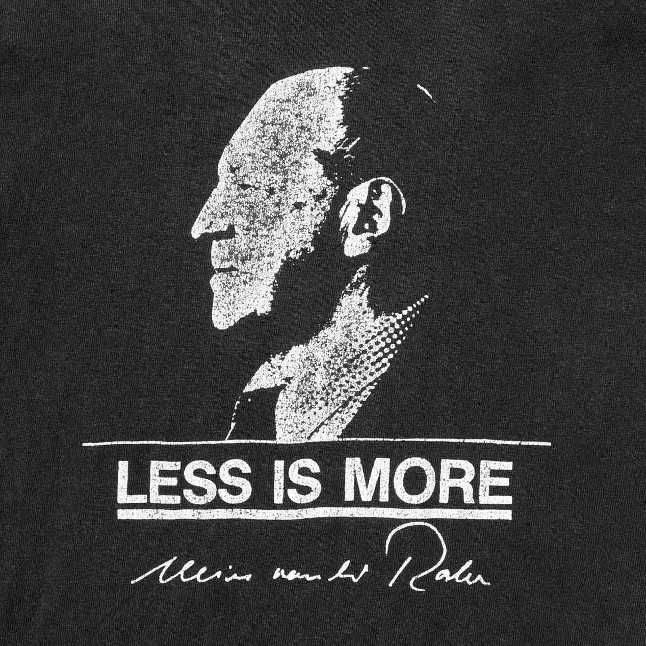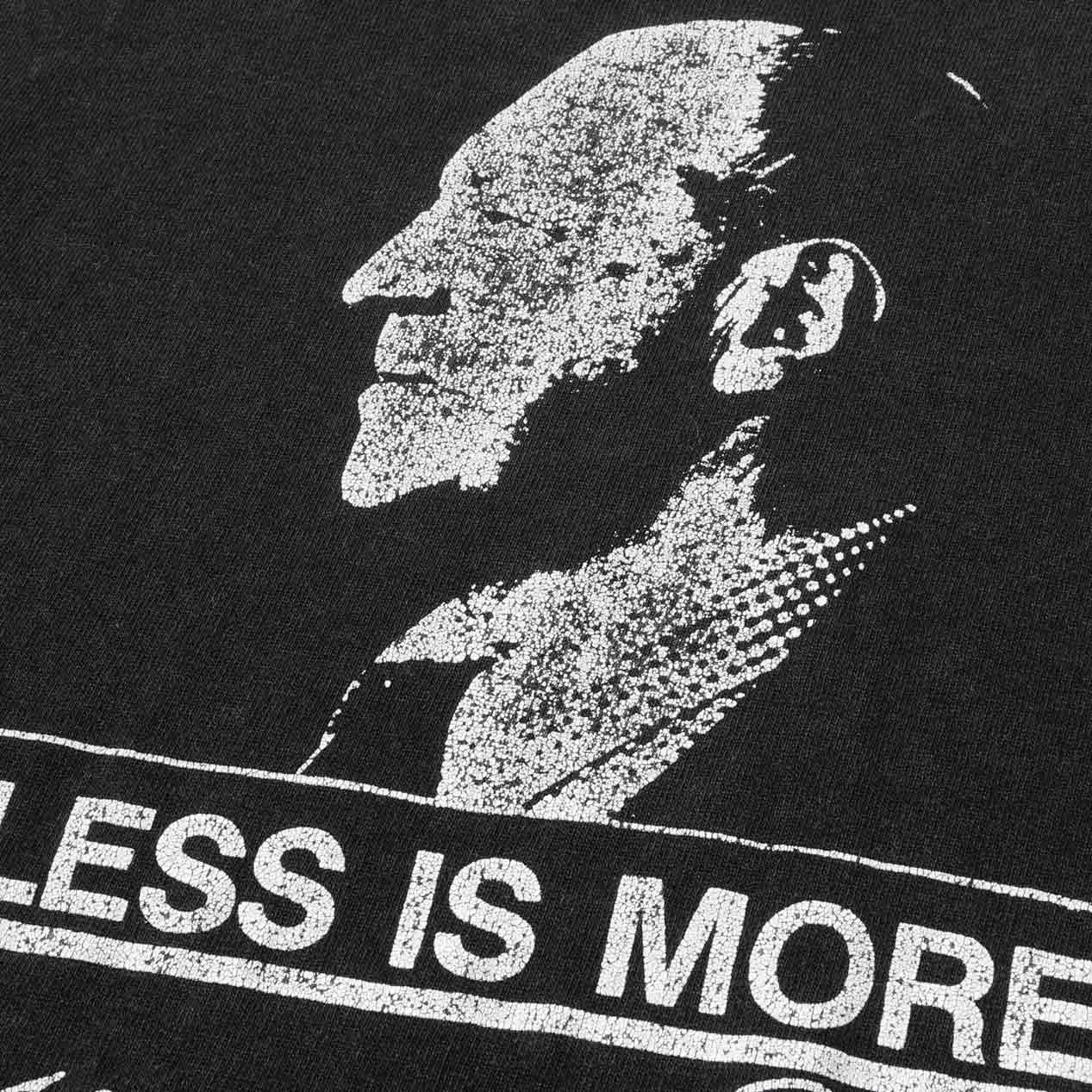 MODEL : MIES VAN DER ROHE ”LESS IS MORE” Tシャツ MANUFACTURE : Made In U.S.A. AGE : 90's SIZE : XL COLOR : ブラック MATERIAL : コットン 100% COMMENT : 90年代、ミース・ファン・デル・ローエのプリントTシャツです。
