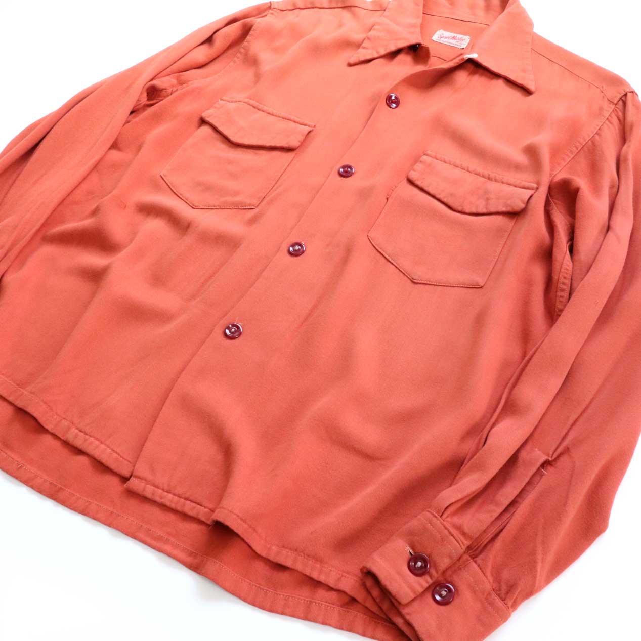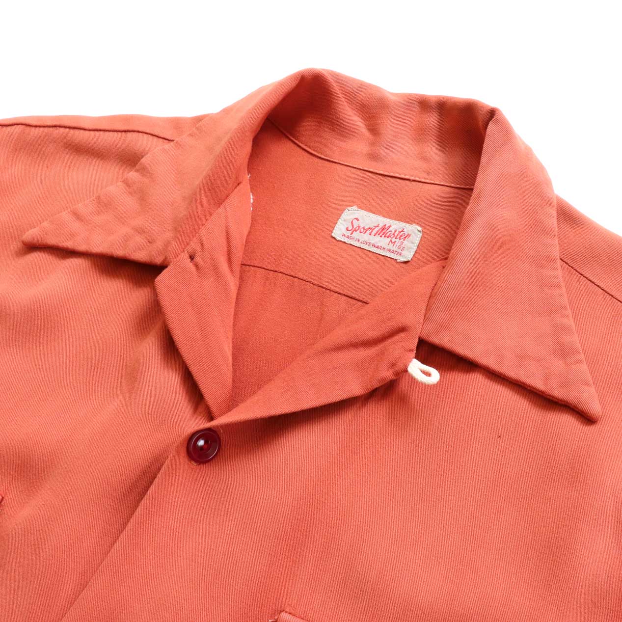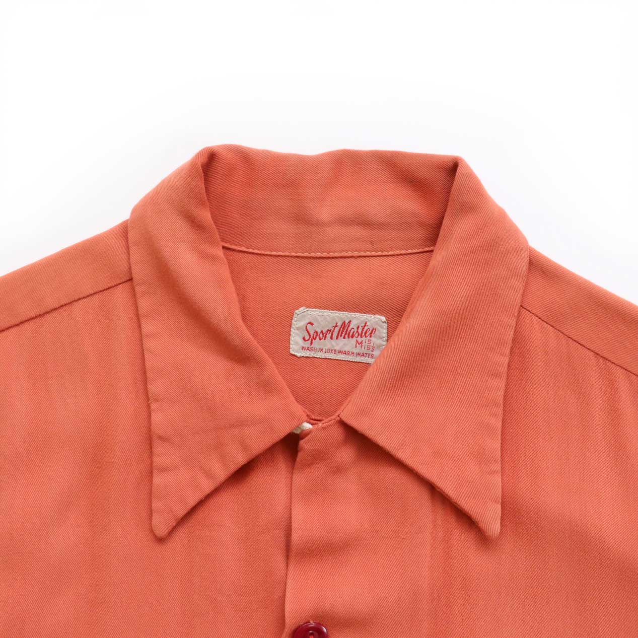 MODEL : SPORT MASTER Rayon Gabardine Shirt MANUFACTURE : --- AGE : 40's SIZE : 15-1/2 M COLOR : アプリコットオレンジ MATERIAL : --- (おそらくレーヨン100%) COMMENT : 40年代、SPORT MASTERのレーヨンギャバジンシャツです。