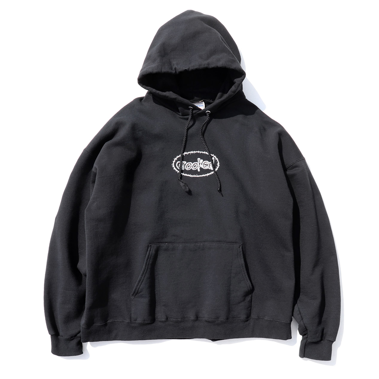 MODEL : UNKNOWN ”CROOKED” プルオーバーパーカー MANUFACTURE : Made In El Salvador AGE : 00's SIZE : XL COLOR : ブラック MATERIAL : コットン 90% ポリエステル 10% COMMENT : 00年代、詳細不明のプルオーバーパーカーです。