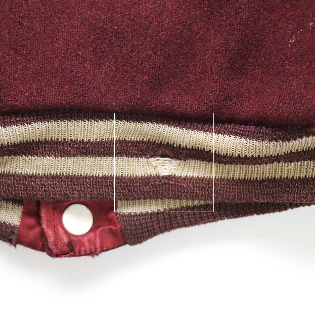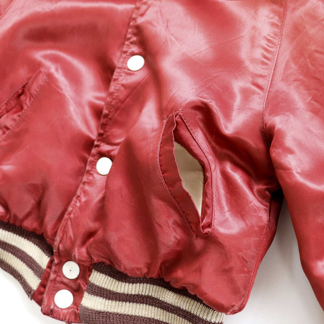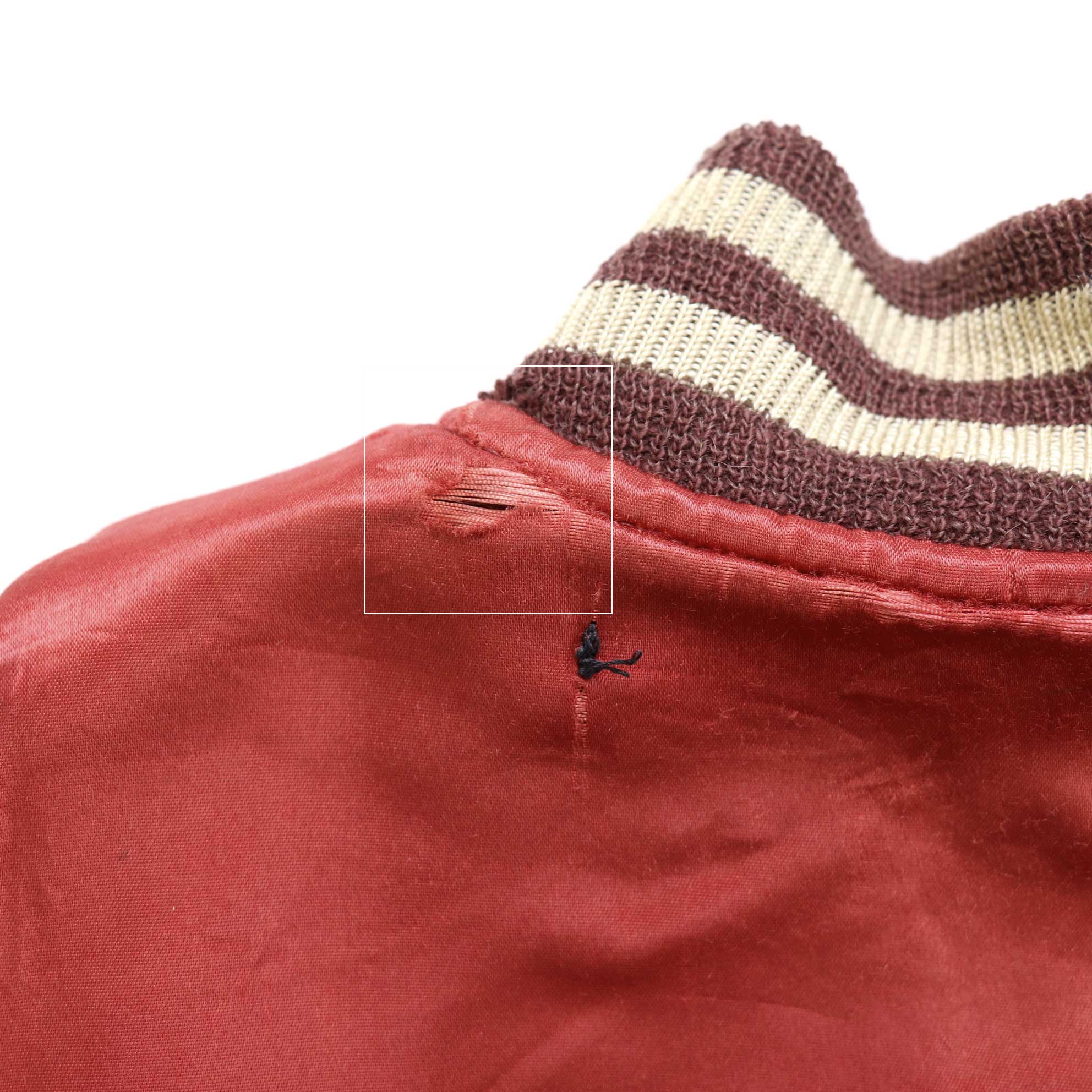 衿・袖口・裾のリブに小穴、サテン側の後衿下にほつれ、フロントドットボタンの塗装はげ
