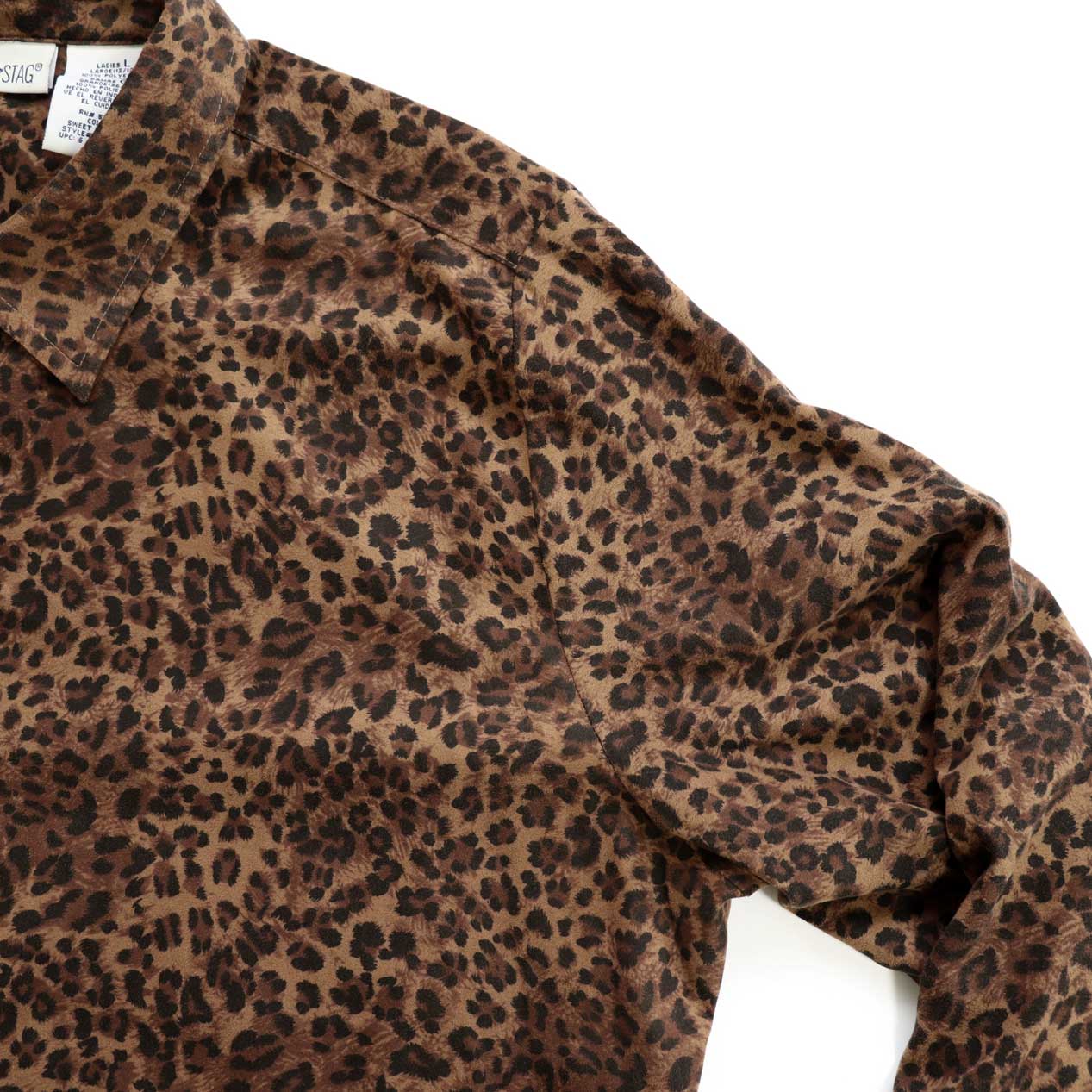 MODEL : WHITE STAG Leopard Pattern Shirt MANUFACTURE : Made In Indonesia AGE : 90's SIZE : Ladies L COLOR : ブラウン系 MATERIAL : ポリエステル 100% COMMENT : 90年代、ホワイトスタッグの豹柄シャツです。