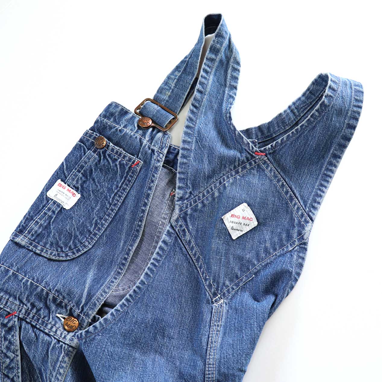 MODEL : BIG MAC "SQUARE BAK" Overall MANUFACTURE : Made In U.S.A. AGE : 60's SIZE : --- (33~34インチ相当) COLOR : インディゴ MATERIAL : コットン 100% COMMENT : 60年代、BIG MACのデニムオーバーオールです。