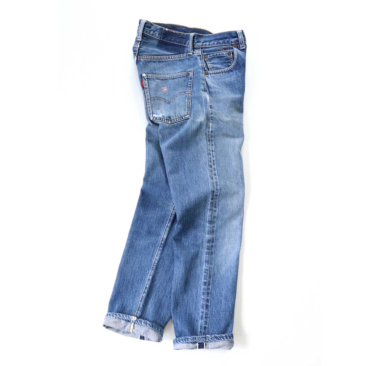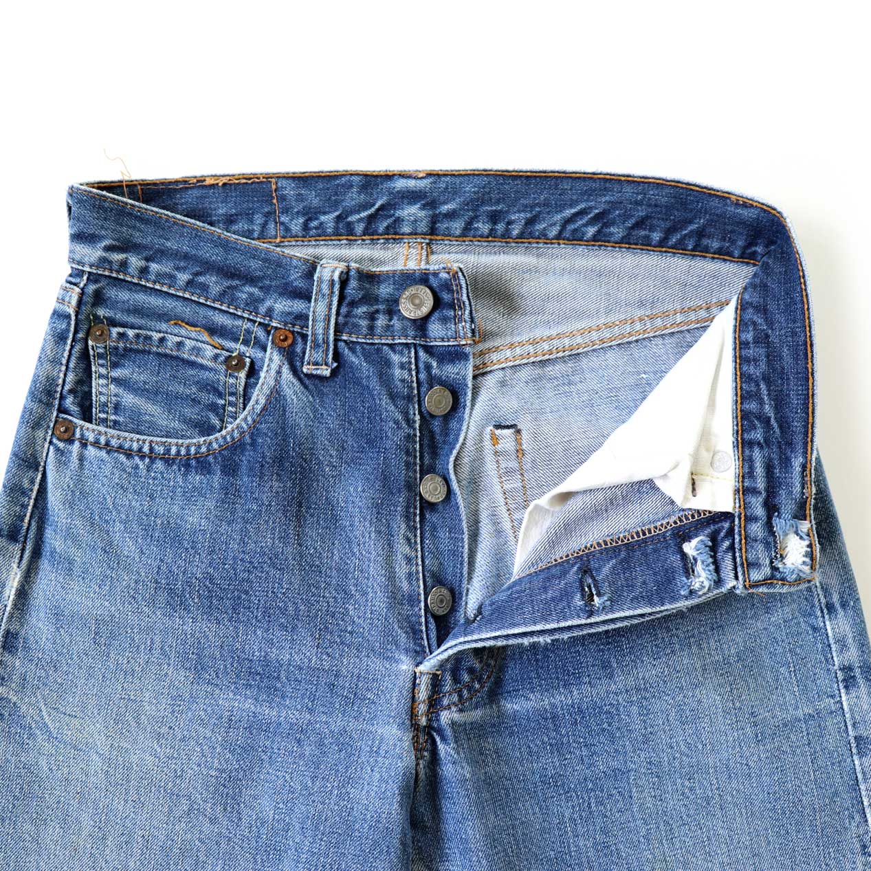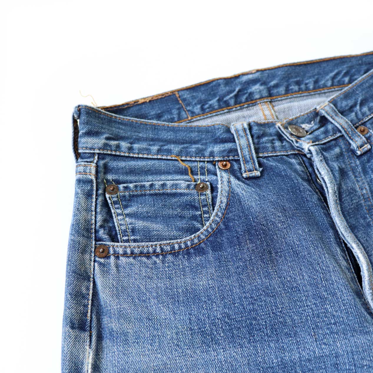 色は薄めですがのっぺりとした色の落ち方ではなく、ヴィンテージデニム特有の立体感をしっかり残しています。