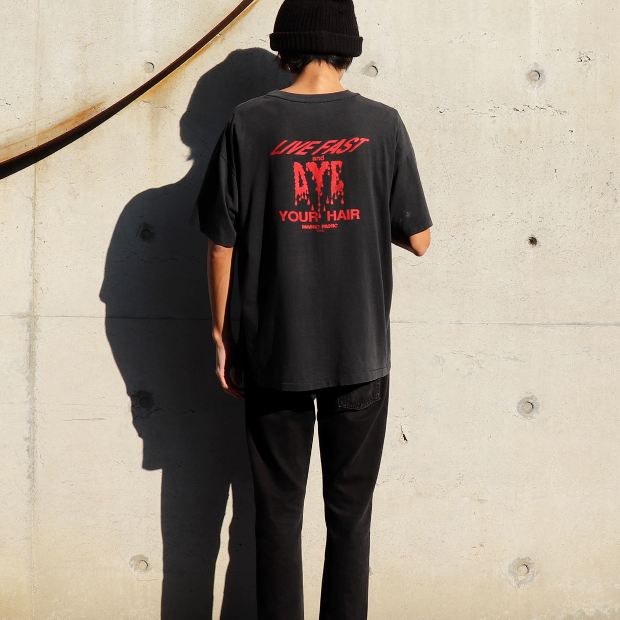 MODEL : MANIC PANIC “LIVE FAST AND DYE YOUR HAIR” MANUFACTURE : Made In U.S.A. AGE : 90's SIZE : XL COLOR : ブラック MATERIAL : コットン 50% ポリエステル 50% COMMENT : 90年代、マニックパニックのプリントTシャツです。