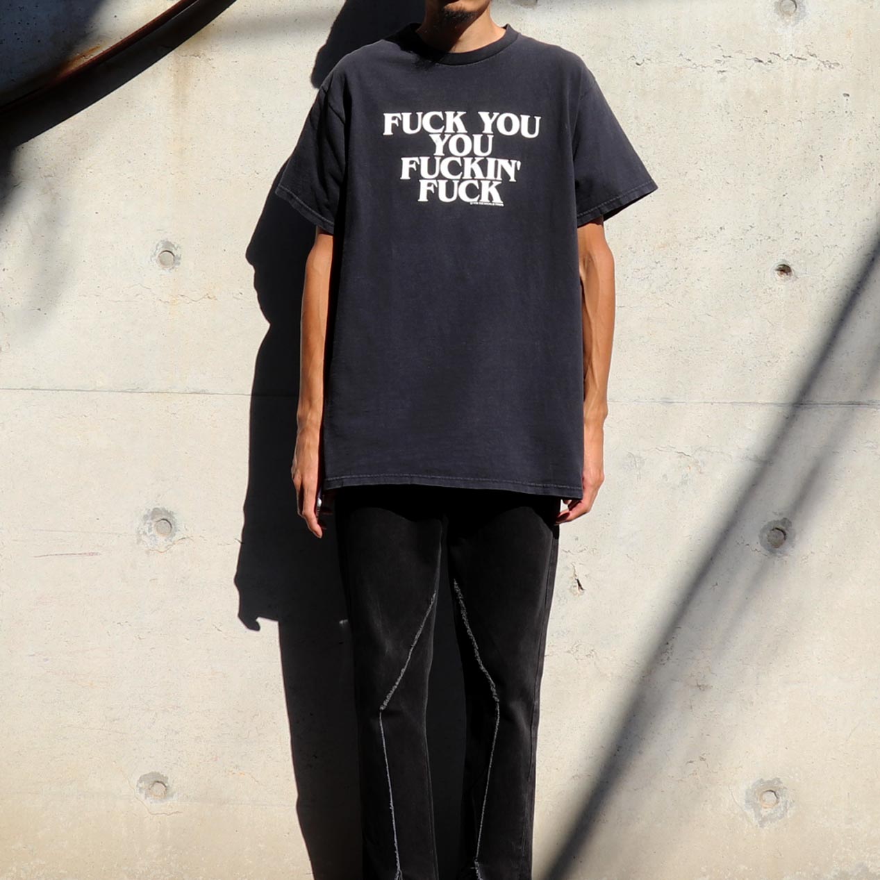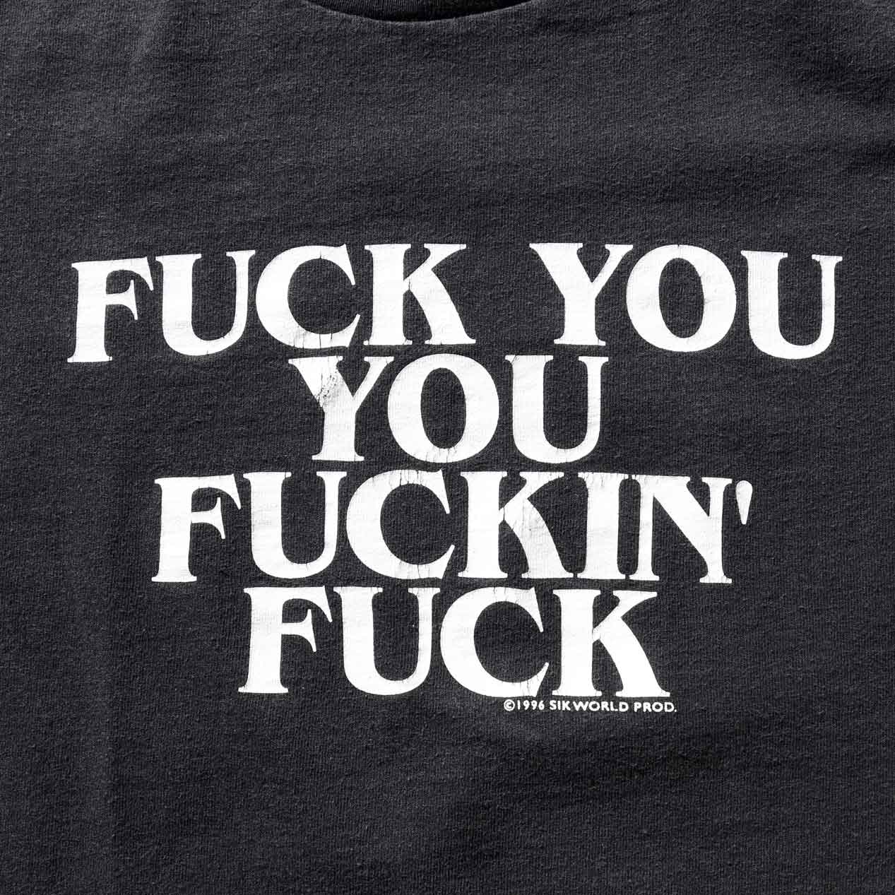 MODEL : SIK WORLD “FUCK YOU YOU FUCKIN’ FUCK” T-Shirt MANUFACTURE : Made In U.S.A. AGE : 90's SIZE : L COLOR : ブラック MATERIAL : コットン 100% COMMENT : 90年代、SIK WORLDのプリントTシャツです。