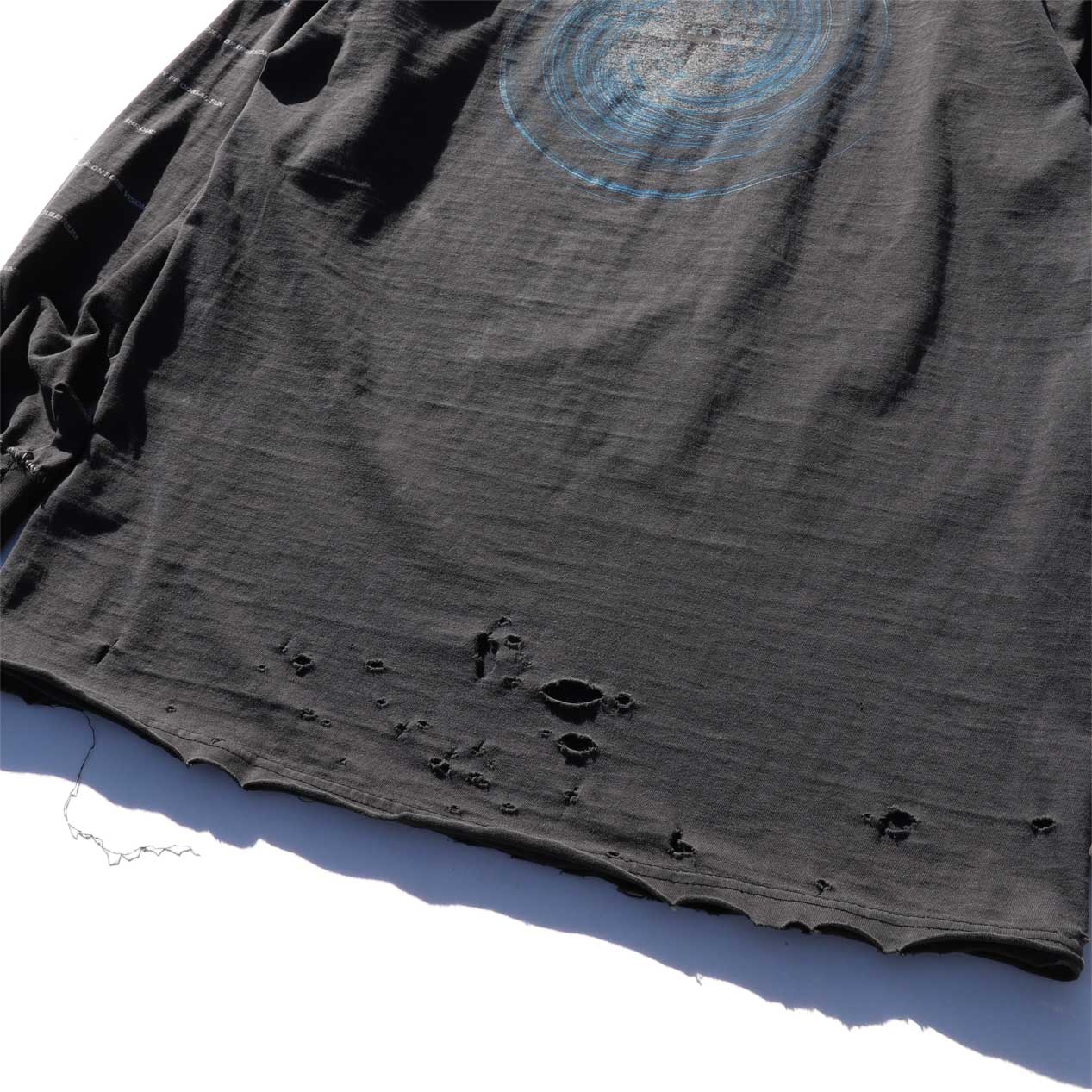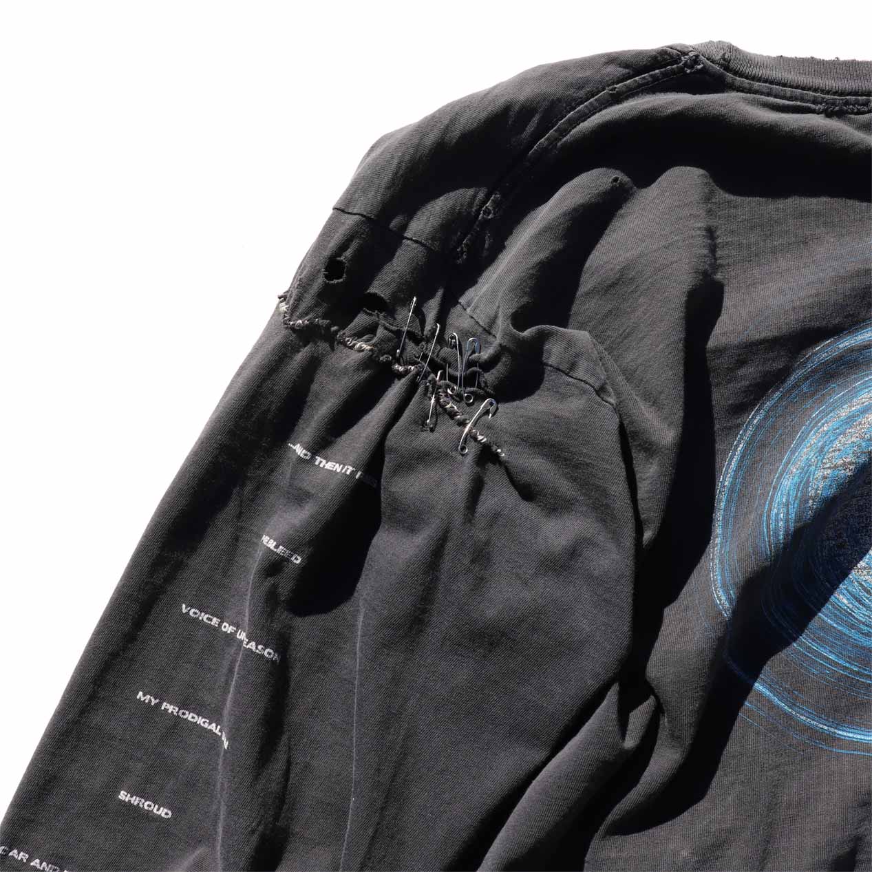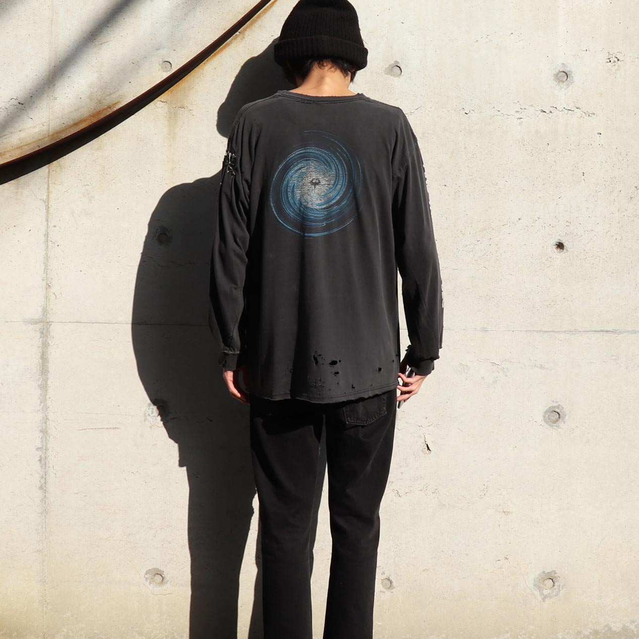 ハードなダメージや墨黒のフェードカラー、手縫いと安全ピンでのリアルなリペア等、スペシャルな仕上がりを見せる一品。