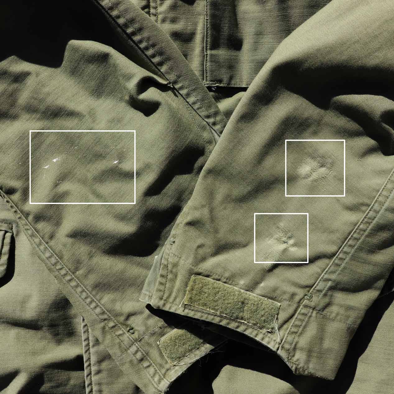 ・袖 : 左袖先にスレ穴・スレによる生地痩せ、右袖にペンキ飛び