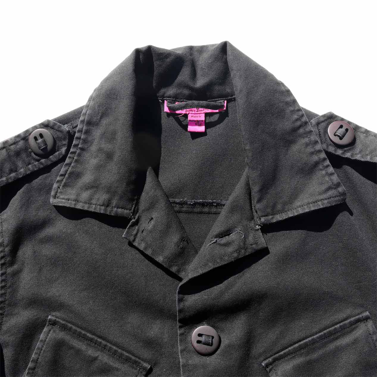 MODEL : BETSEYVILLE BY BETSEY JOHNSON ミリタリージャケット MANUFACTURE : Made In Hong Kong AGE : 00's SIZE : 6 COLOR : ブラック MATERIAL : コットン 96% スパンデックス 4% COMMENT : 00年代、BETSEYVILLE BY BETSEY JOHNSONのミリタリージャケットです。