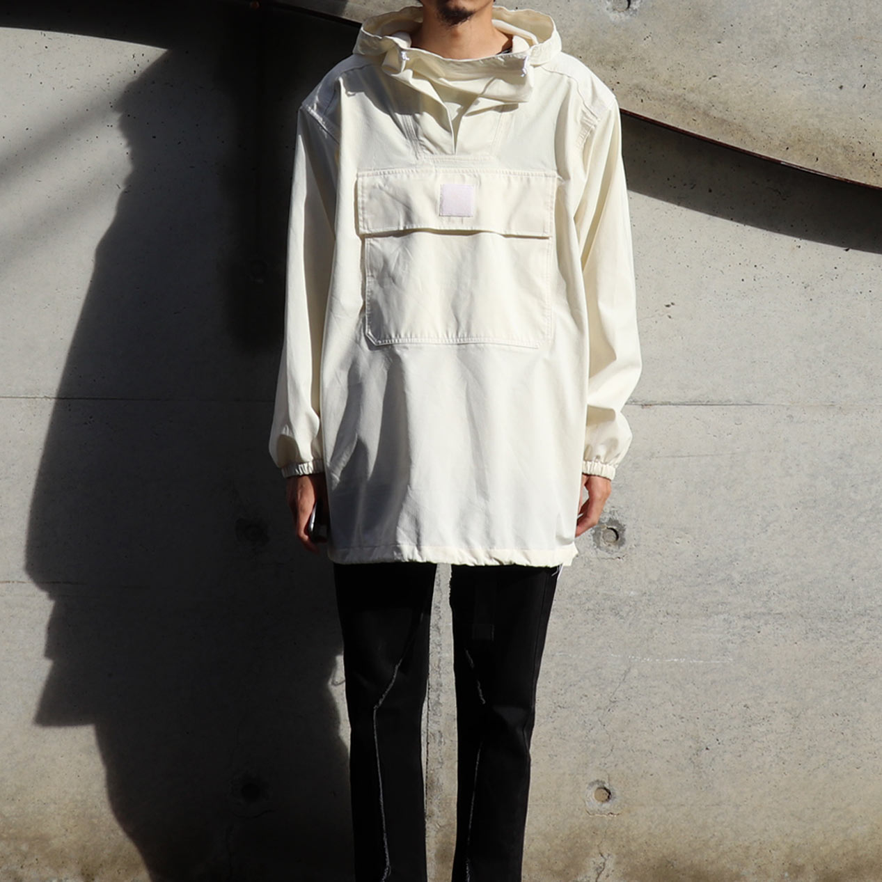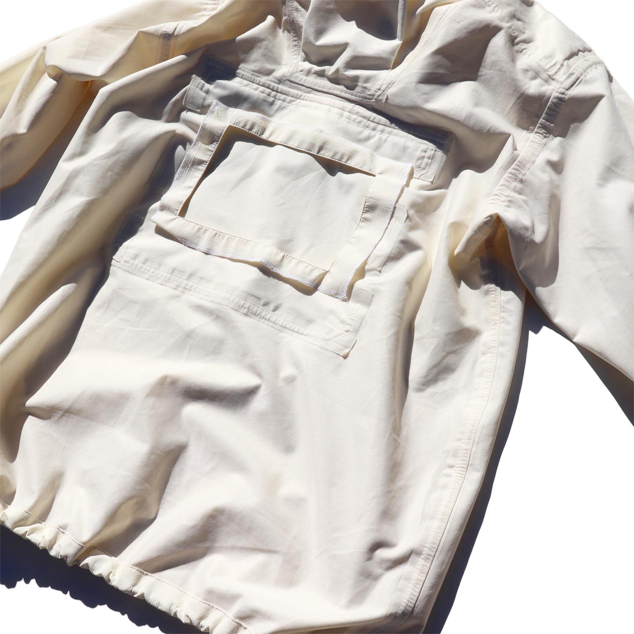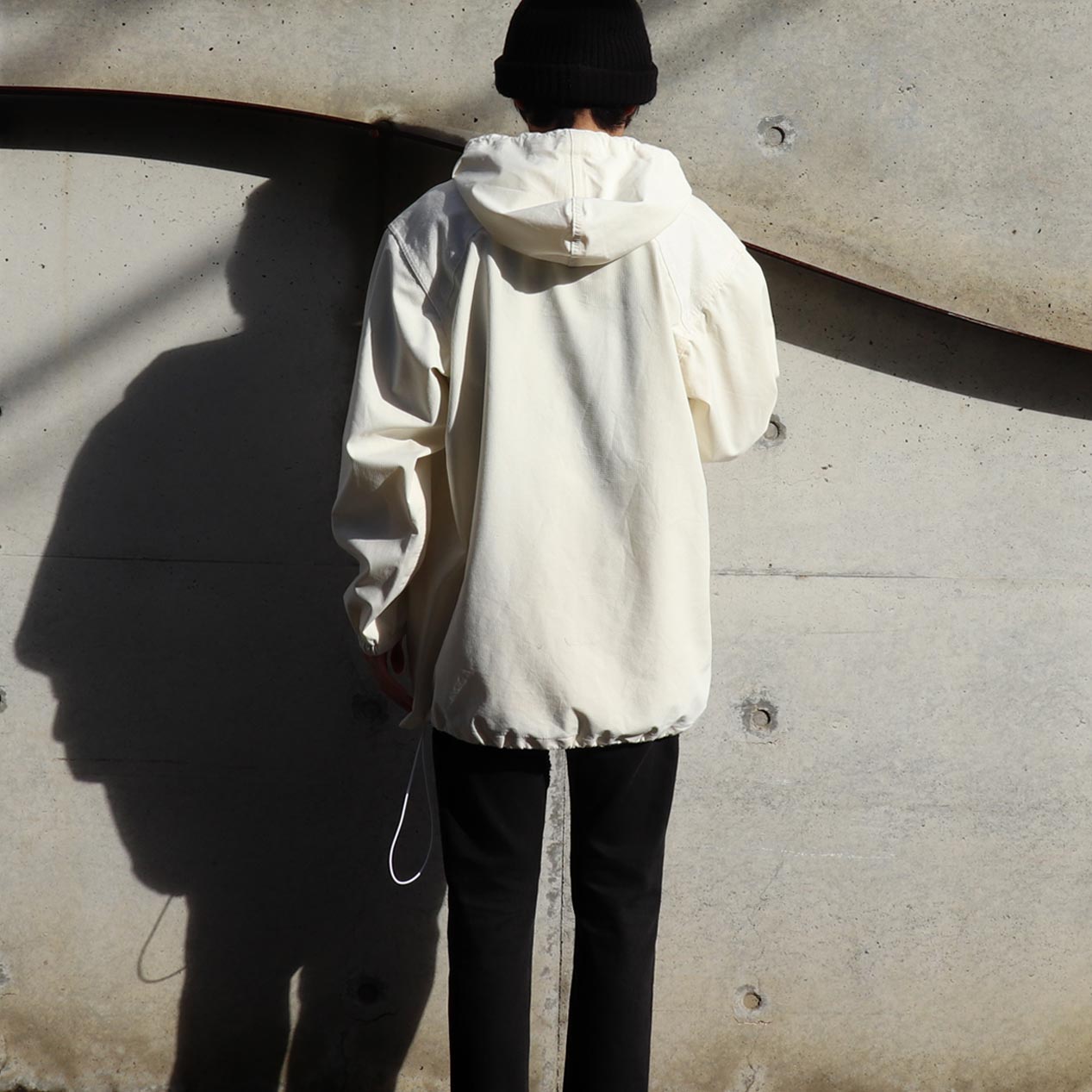 肩部分生地切り替え、内面全てシームテープ貼り、袖先ゴム、身頃裾ドローコード入り。