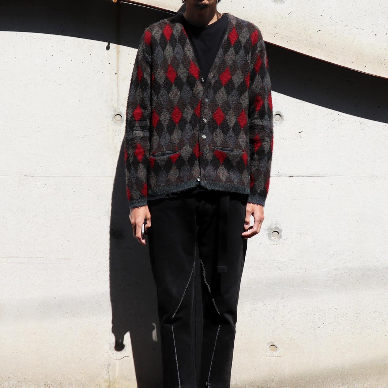 ダークな配色のグッドパターンにモヘアライクなルックスが魅力のアクリルカーディガン。