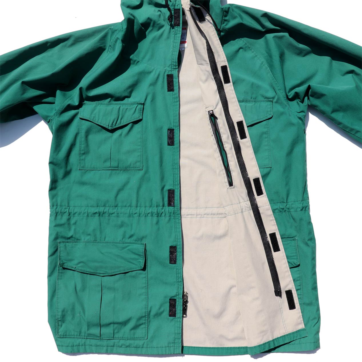 袖先ベルクロバンド留め、ウエストドローコード入り。