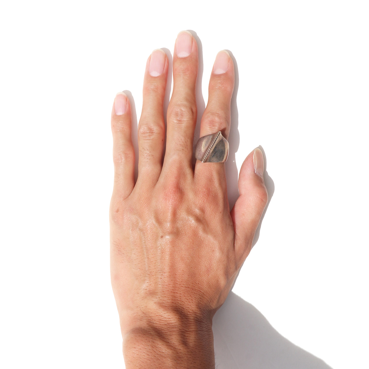 曲線と直線の対比が特徴的なデザイン、中性的な繊細さを持つシルバーリング。
