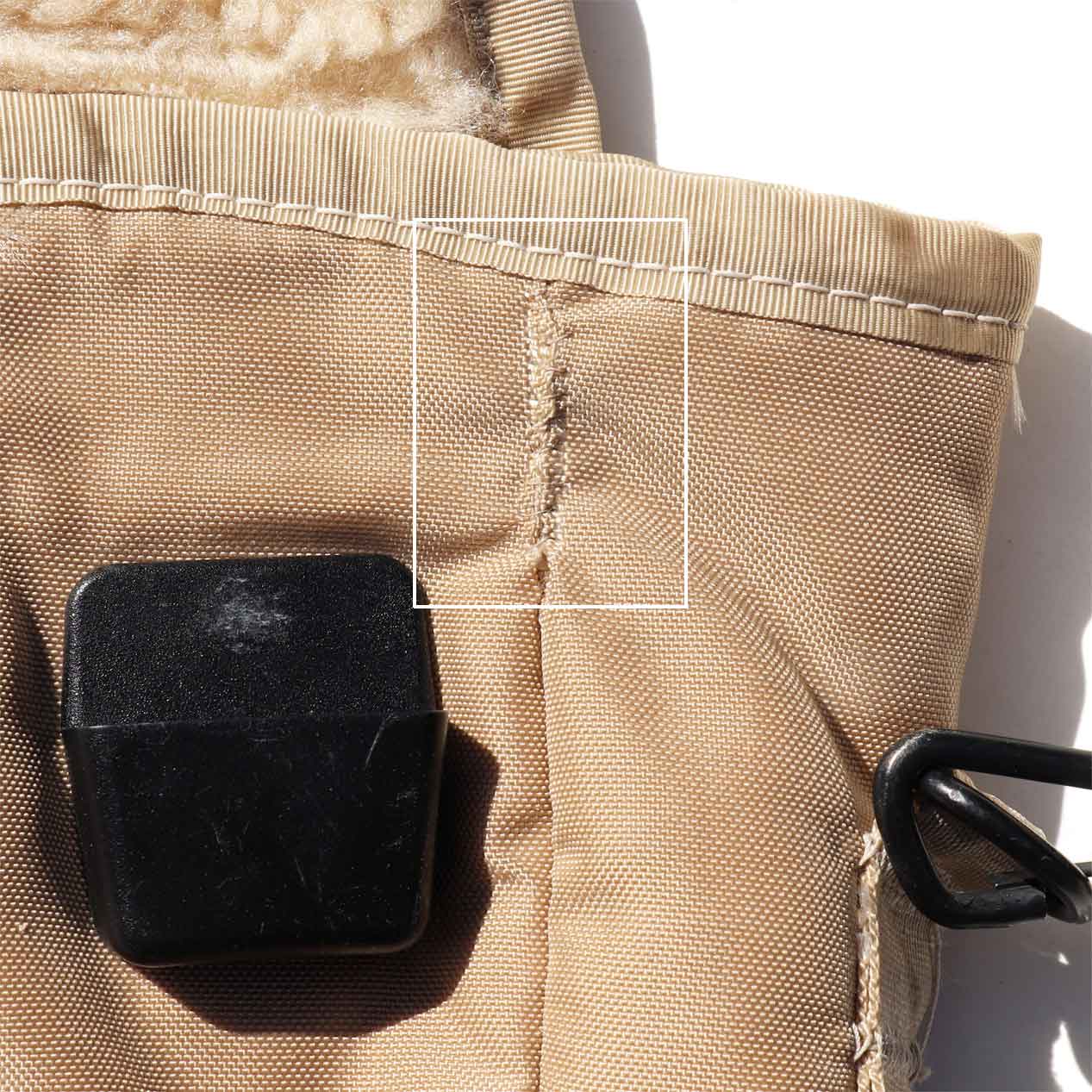 使用感はありませんが、一部縫い目パンクがありましたので手縫いにてリペアを施しています。