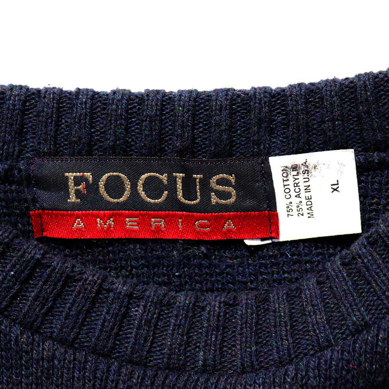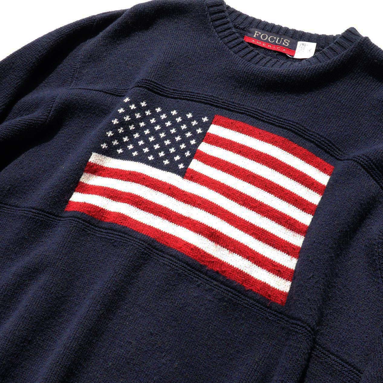 MODEL : FOCUS AMERICA U.S.A. FLAG コットンアクリルニット MANUFACTURE : Made In U.S.A. AGE : --- SIZE : XL COLOR : ネイビー MATERIAL : コットン75% アクリル25% COMMENT : FOCUS AMERICAの星条旗柄ニットです。