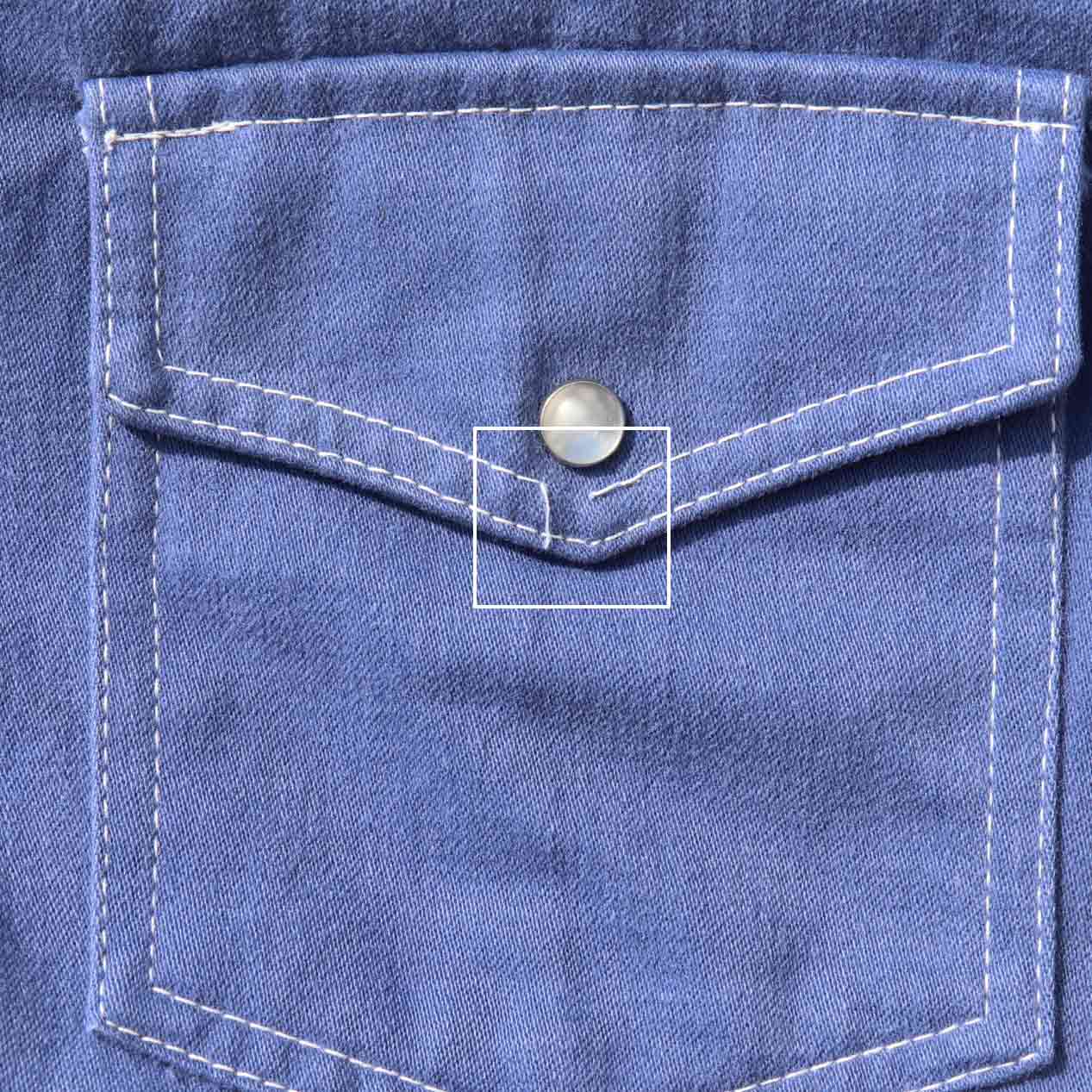 フロント3ポケット、DOT SNAPPERSパールスナップボタン、襟芯入り。