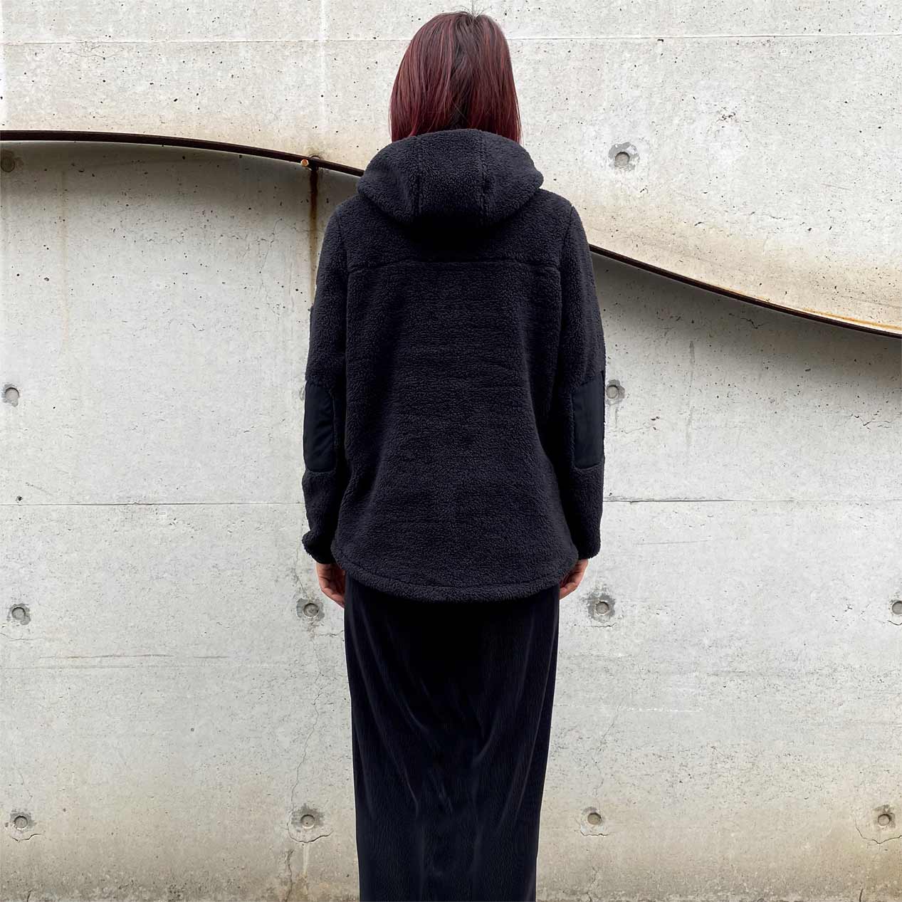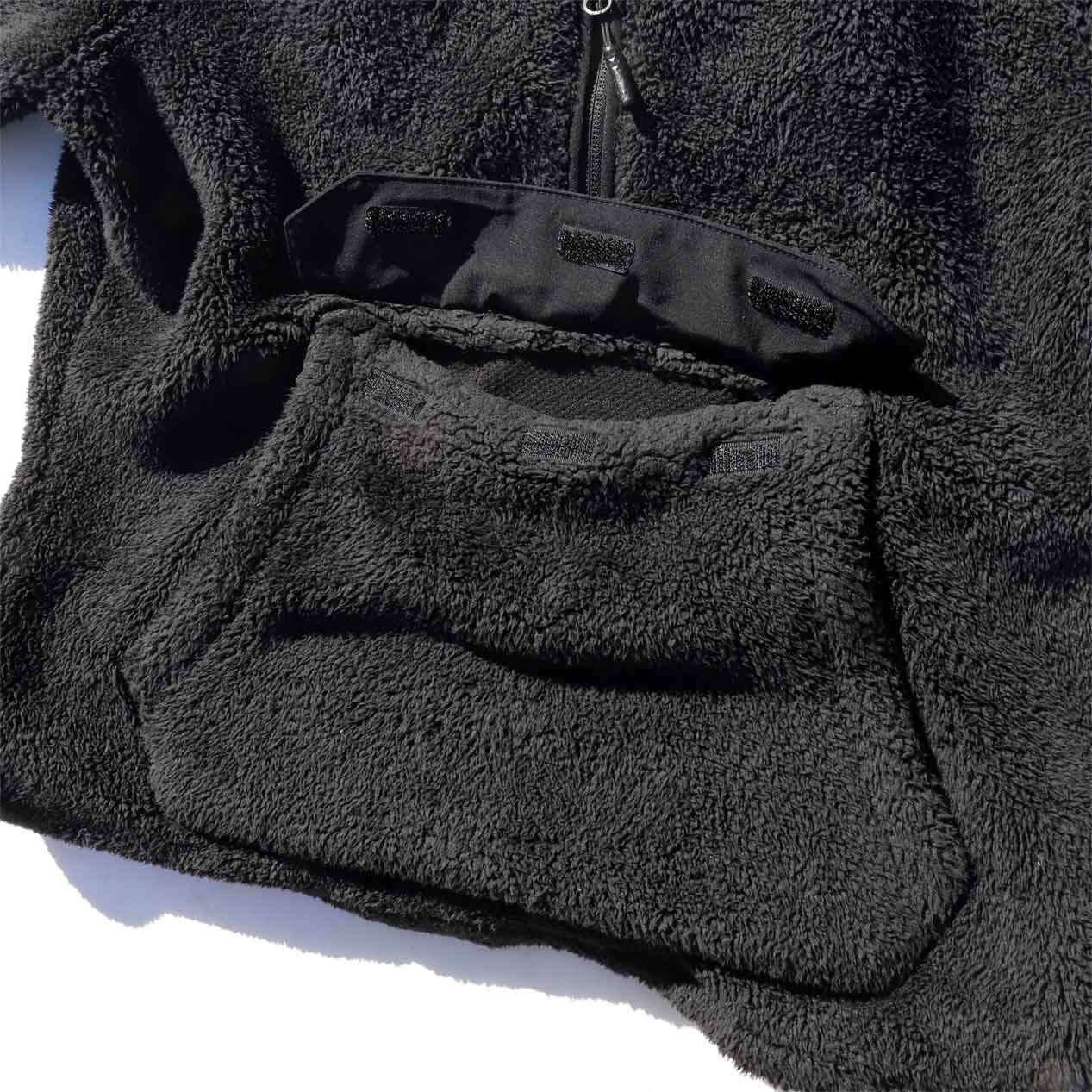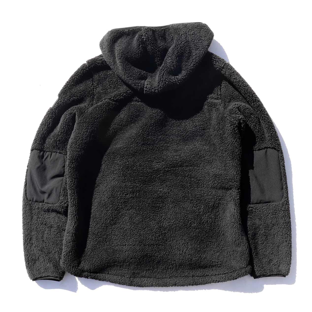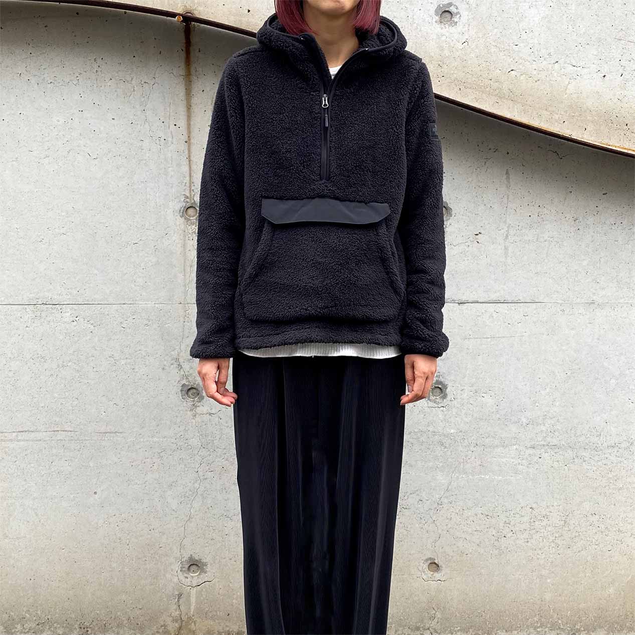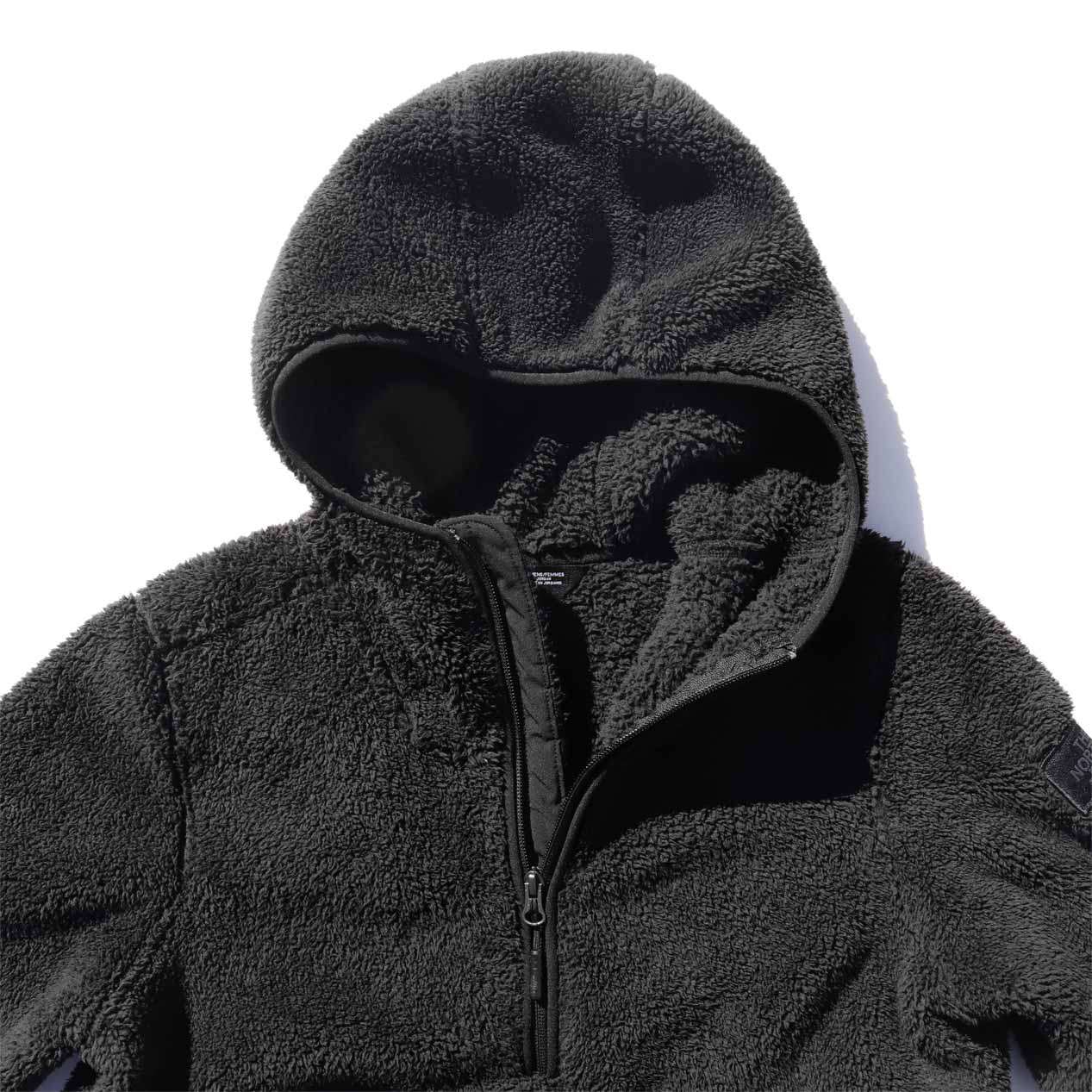 シェルパフリースボディ、ハイネックフードのプルオーバーデザイン。