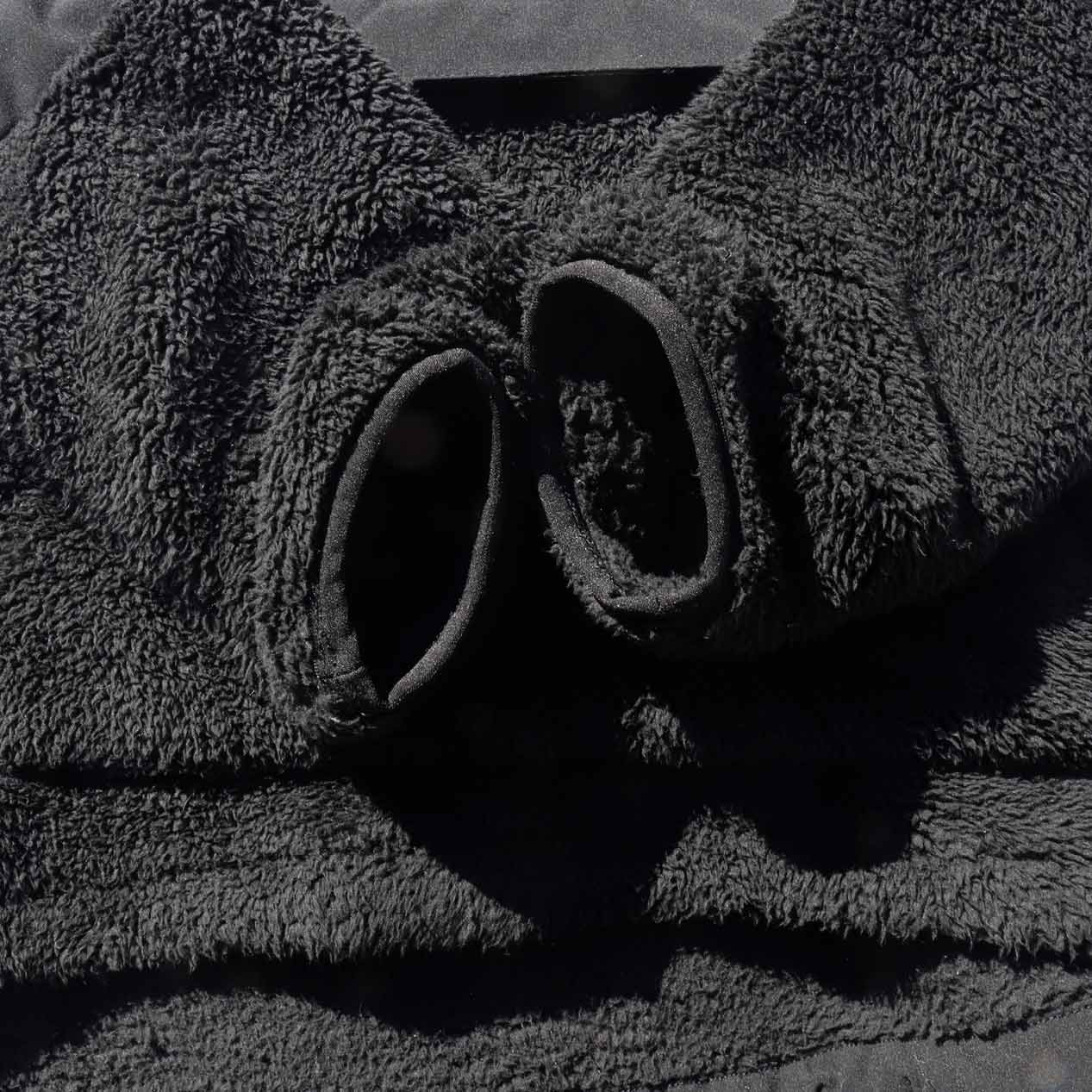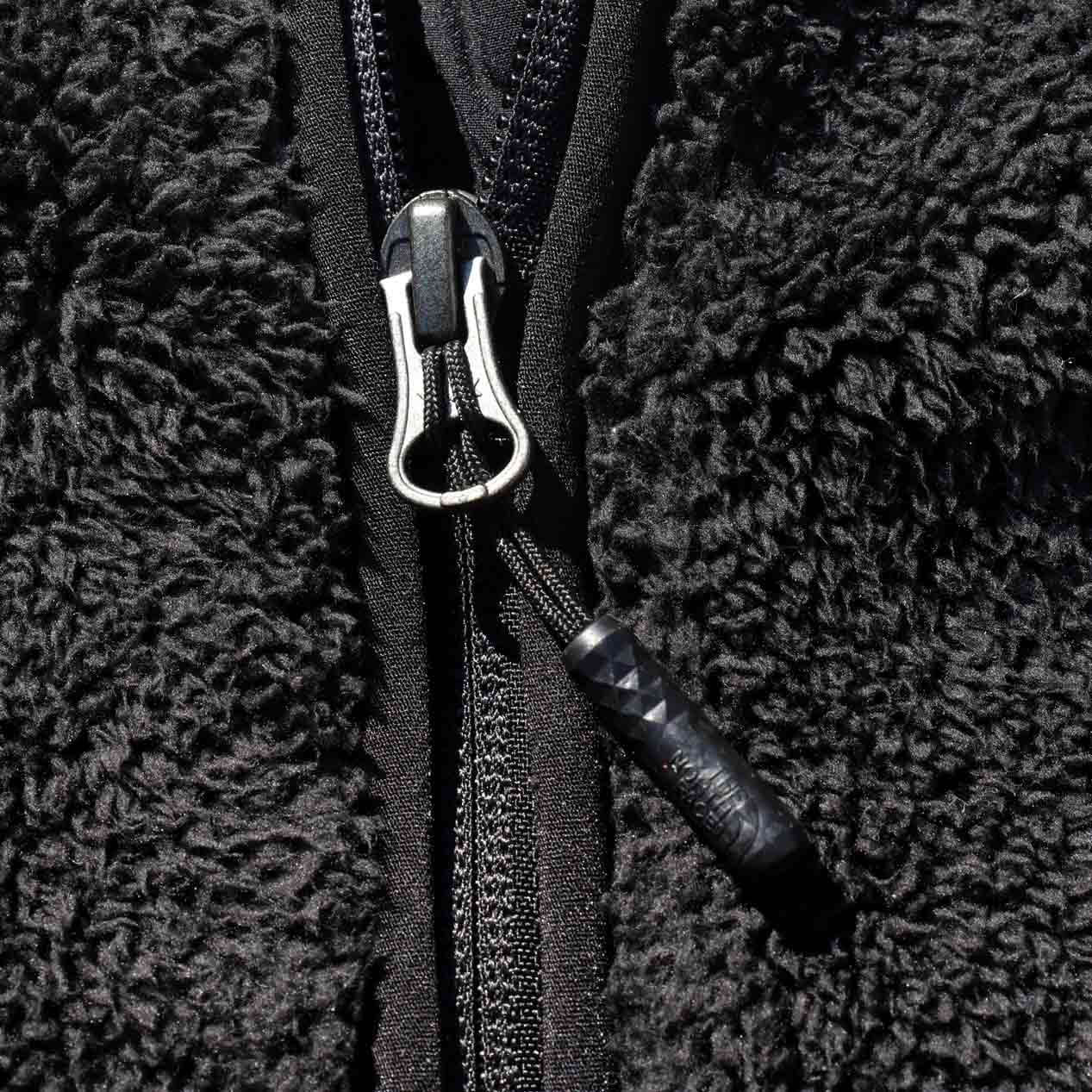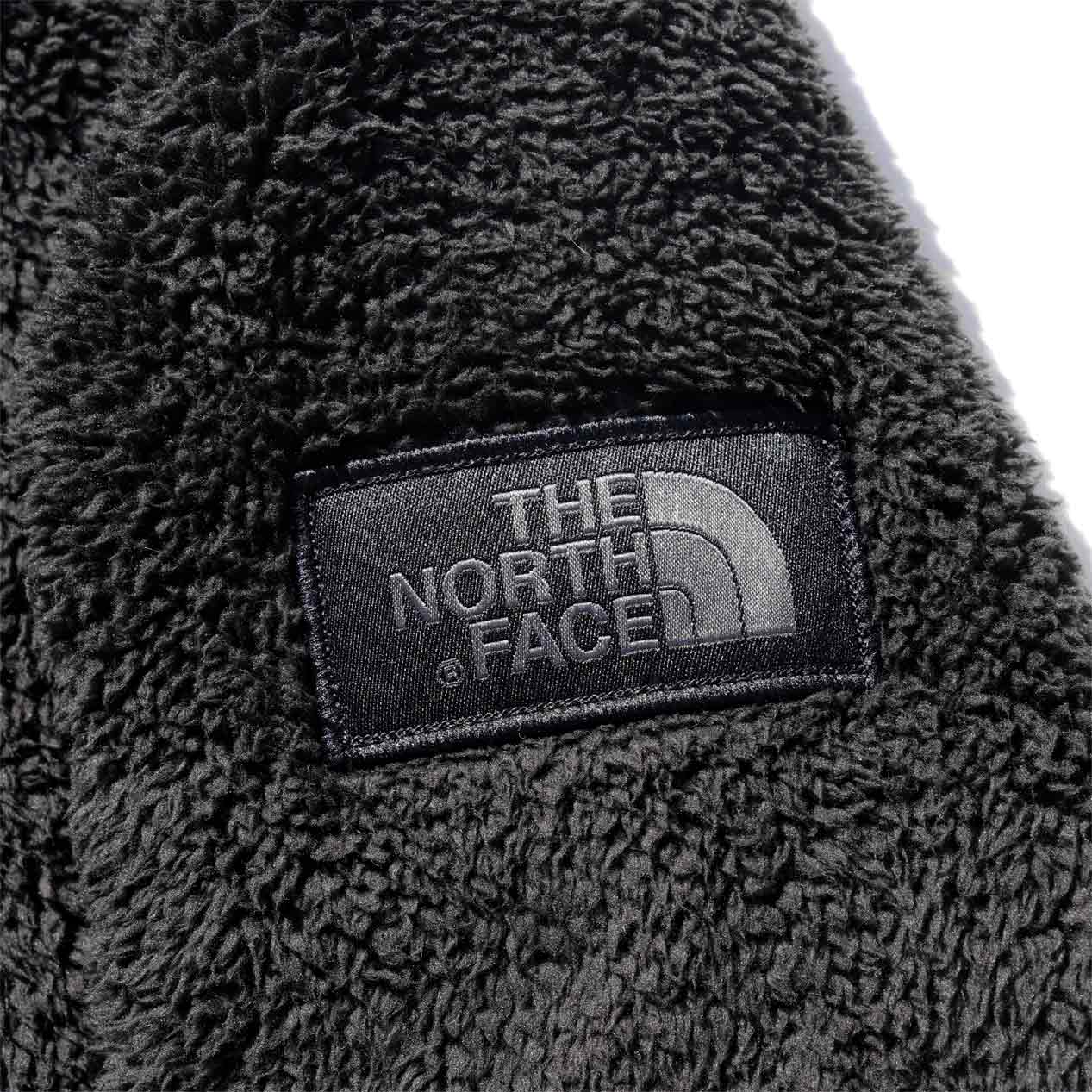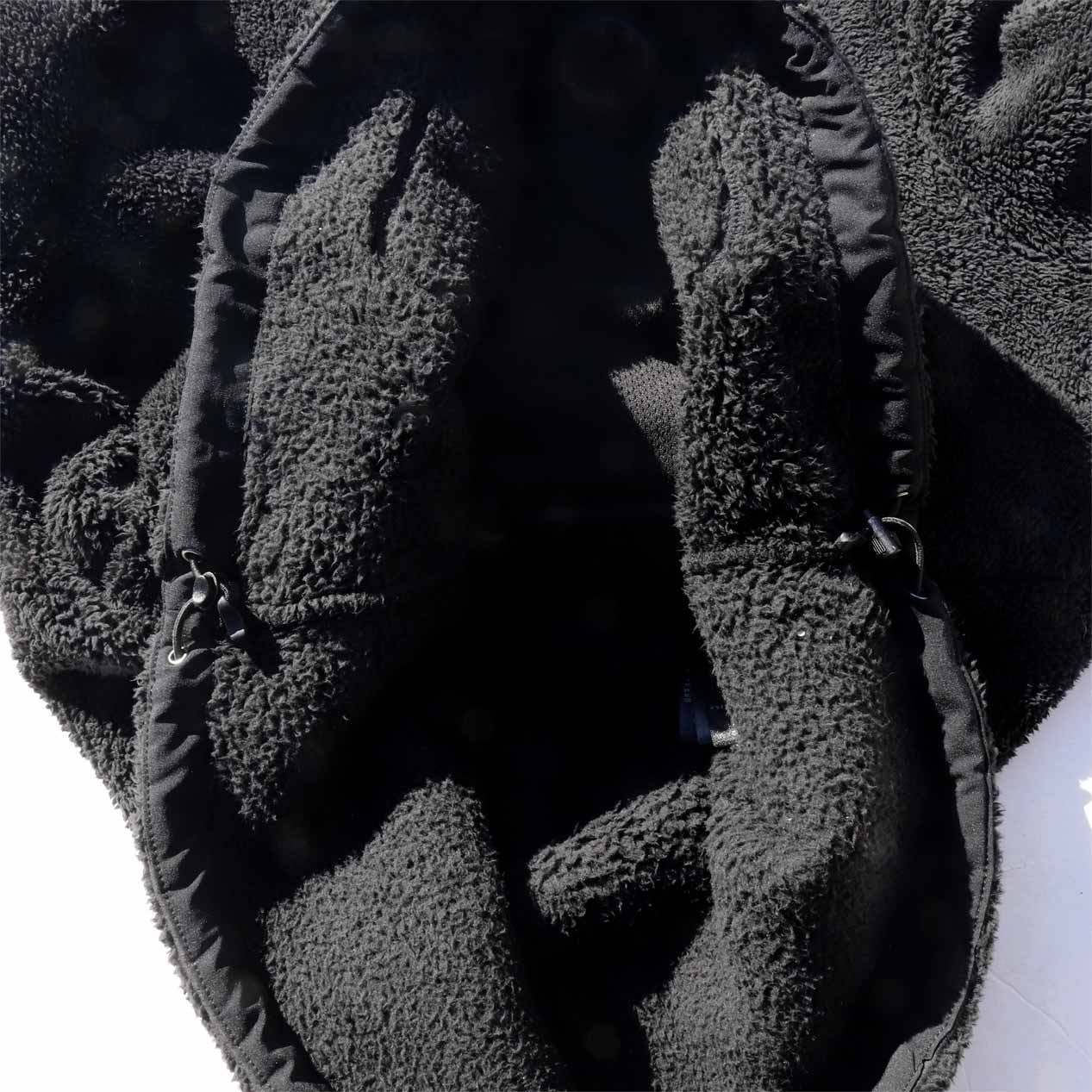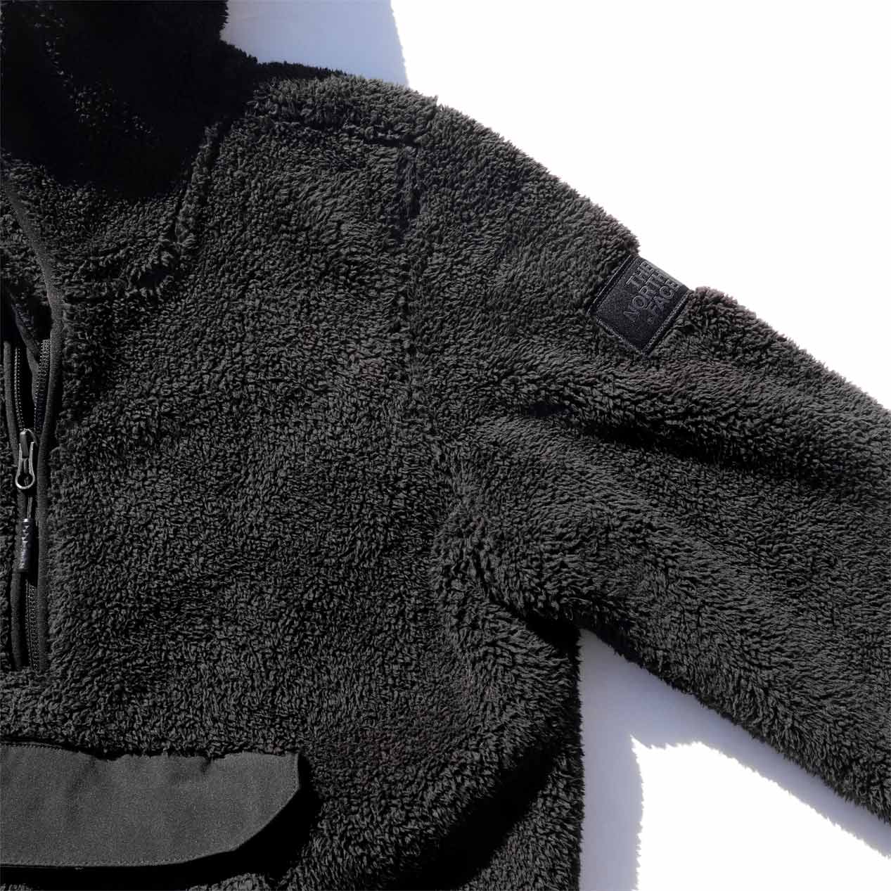 シェルパフリースボディ、ハイネックフードのプルオーバーデザイン。