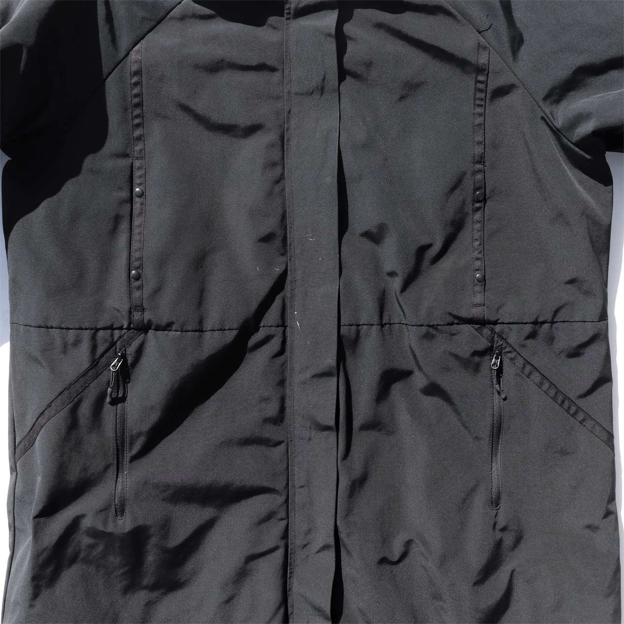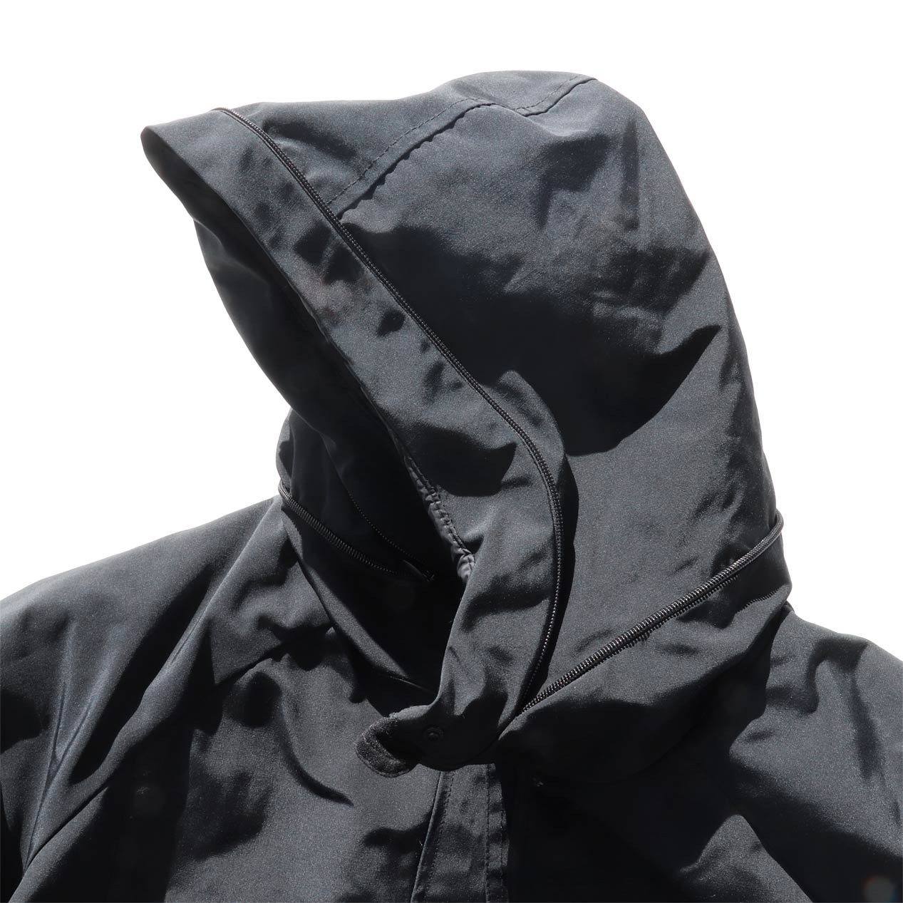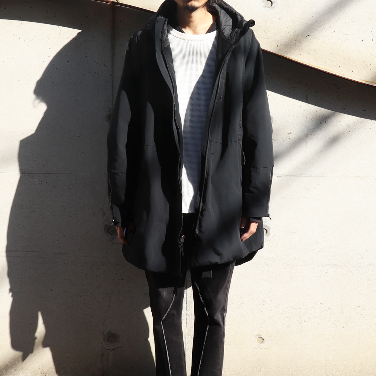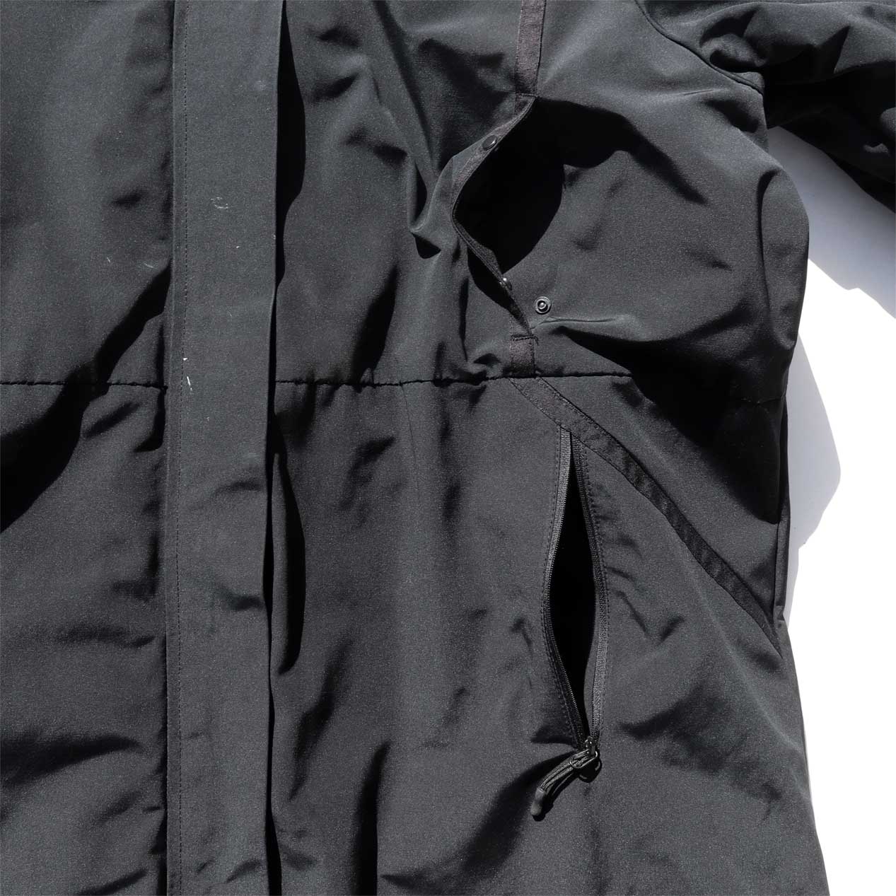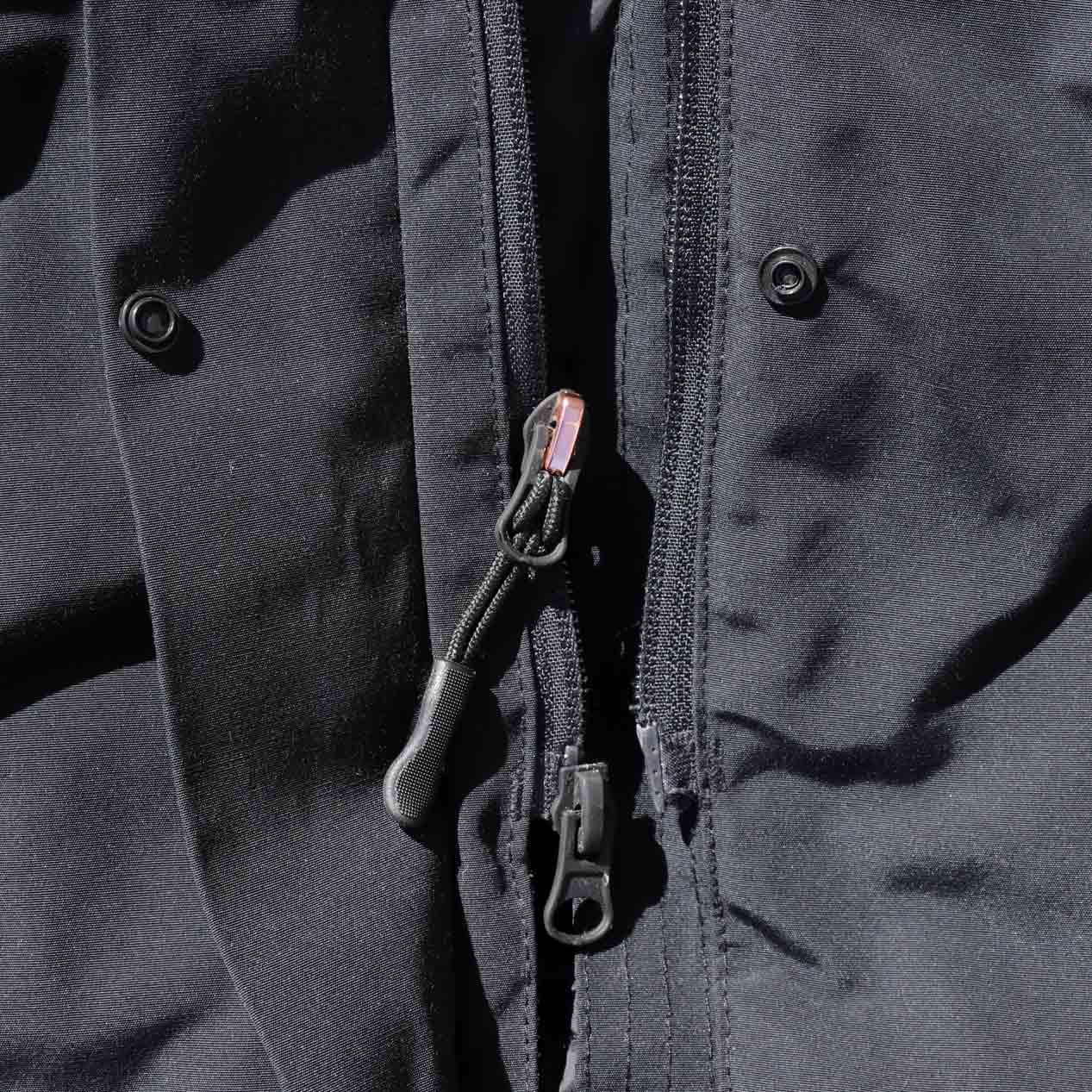 4ポケット、襟収納フード、フロントWジップ+スナップボタン留め、袖口サムホール付き内臓リブ仕様。