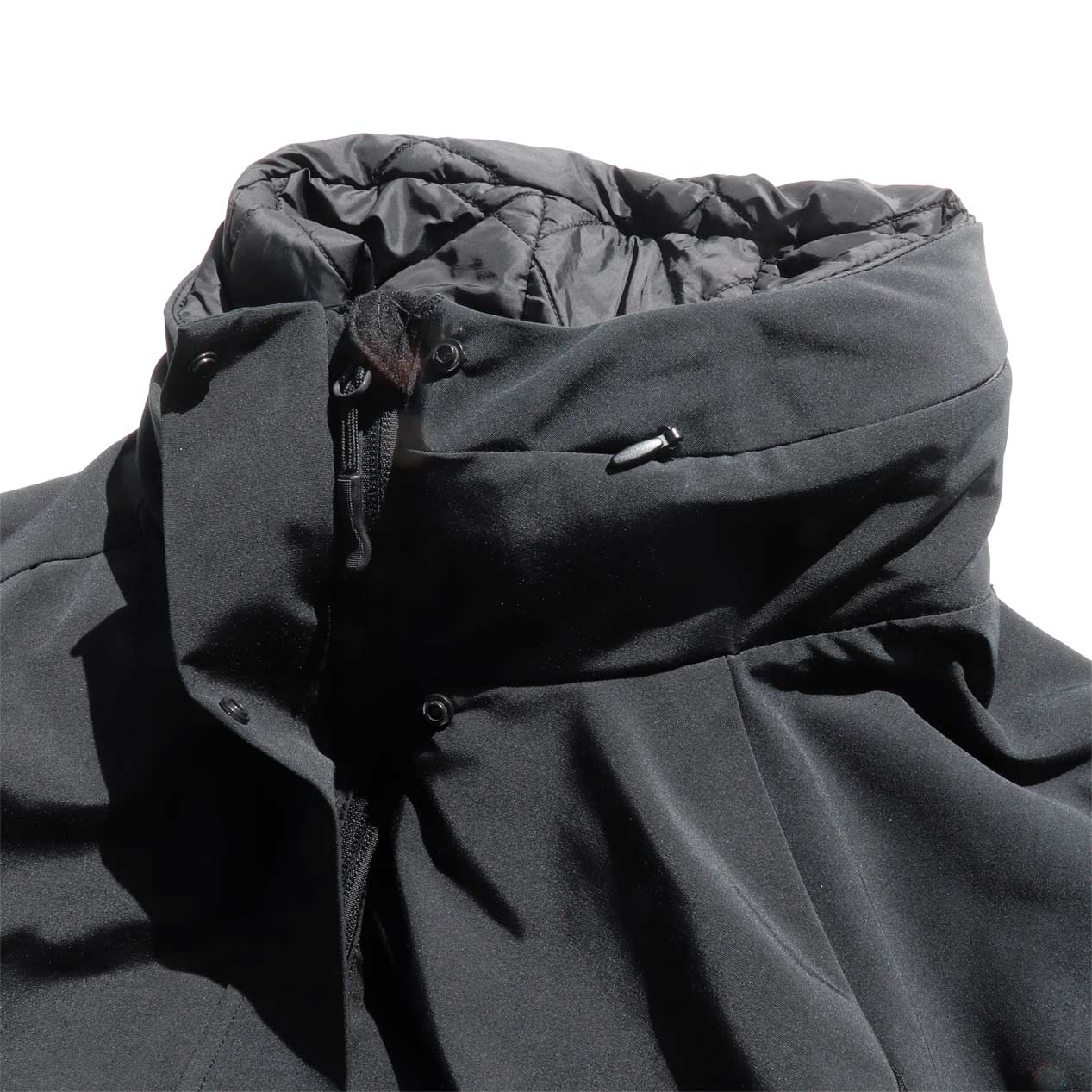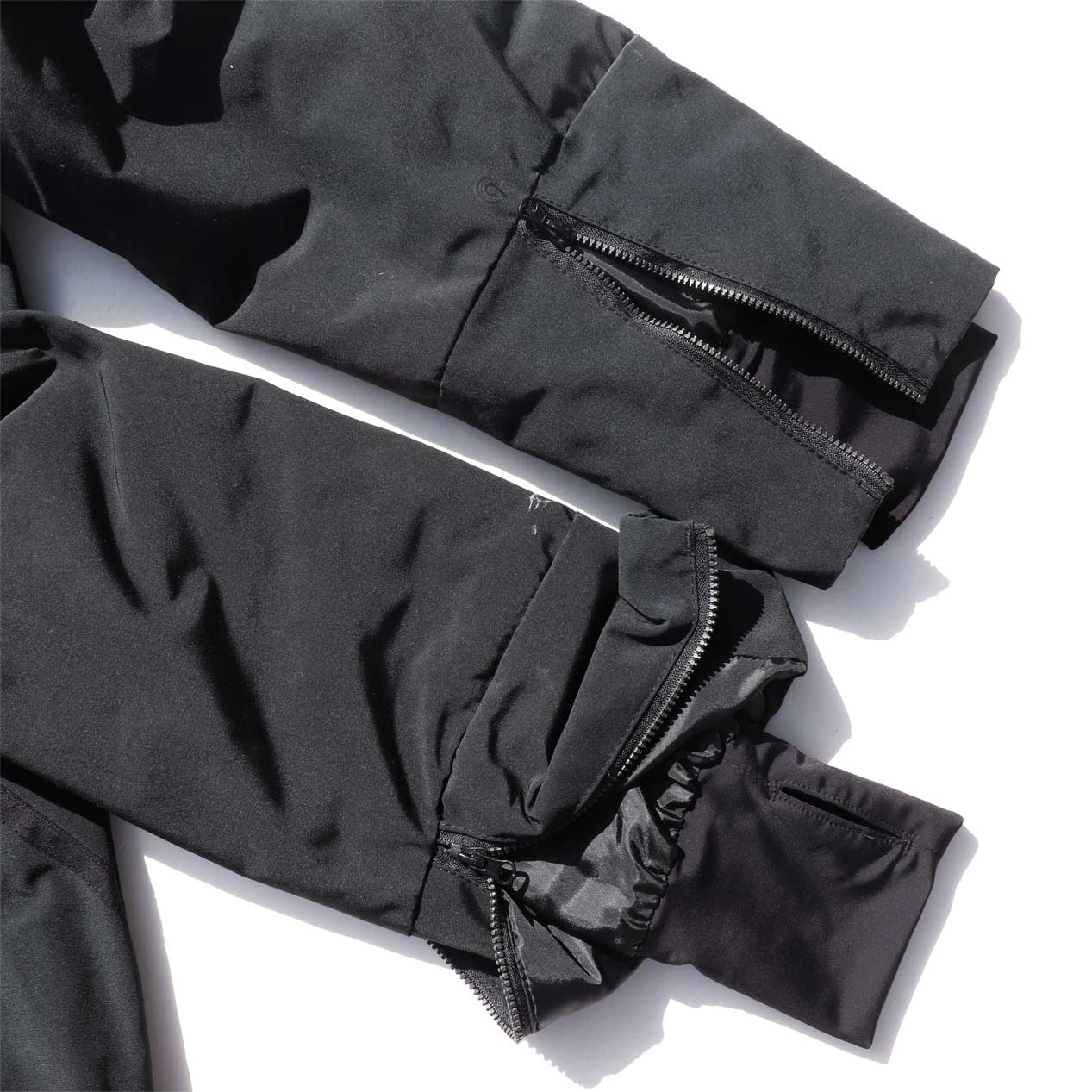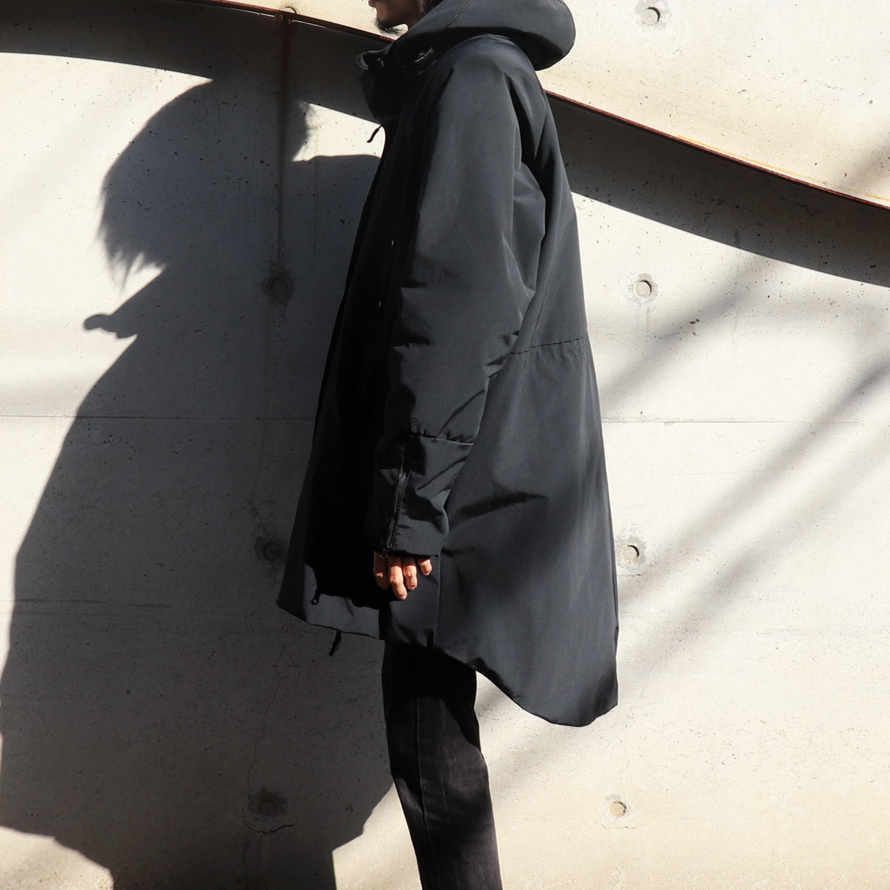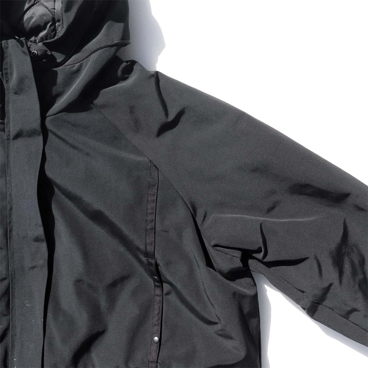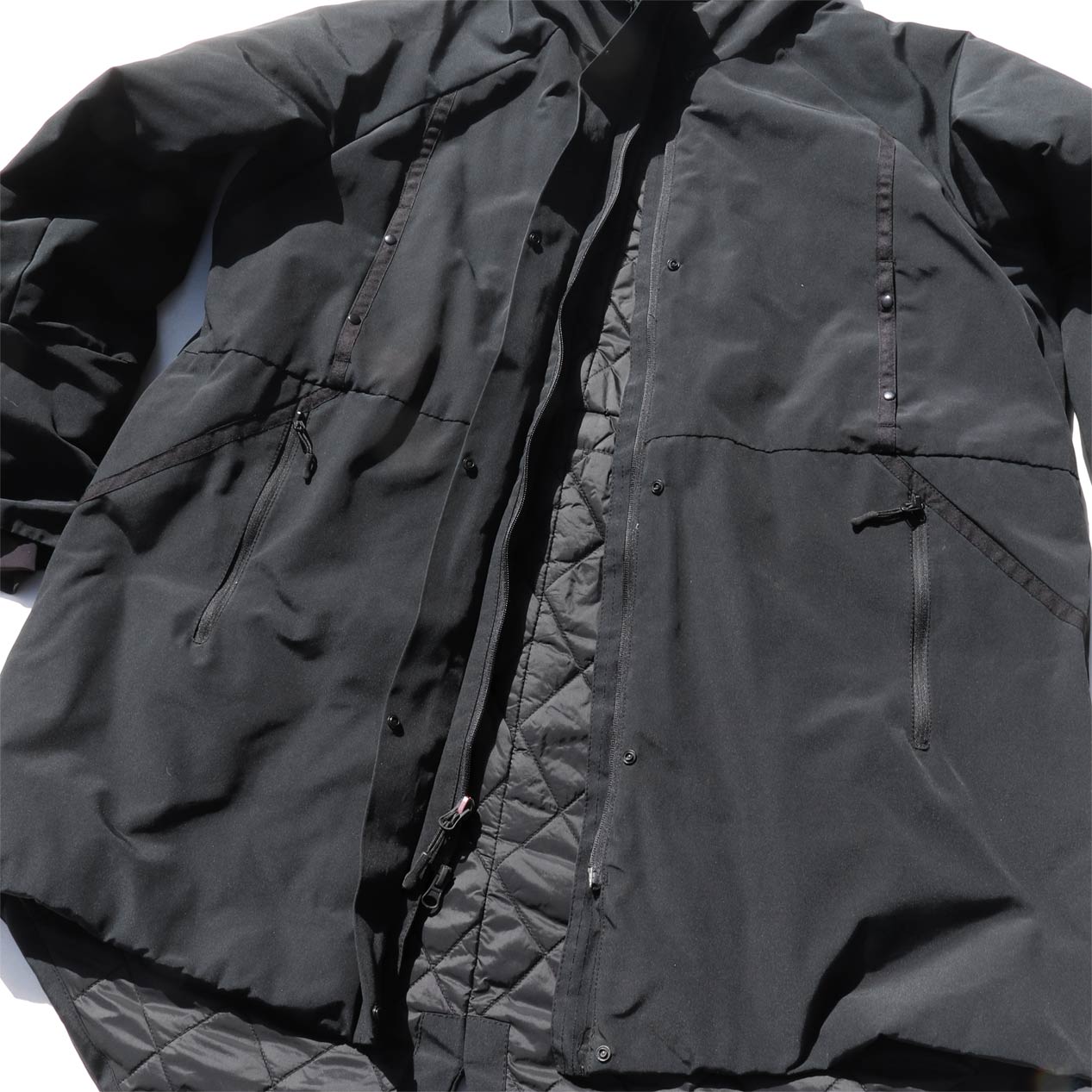 4ポケット、襟収納フード、フロントWジップ+スナップボタン留め、袖口サムホール付き内臓リブ仕様。