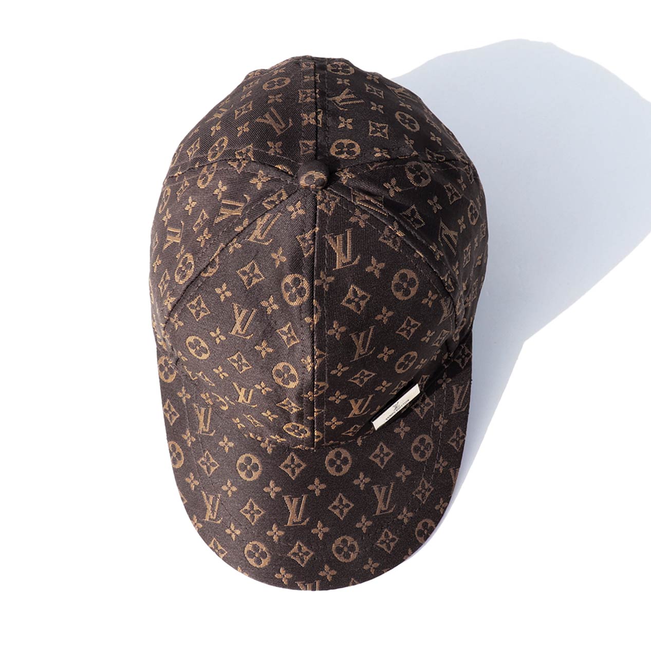 ジャガードモノグラムパターン、額にメタルプレート付き。