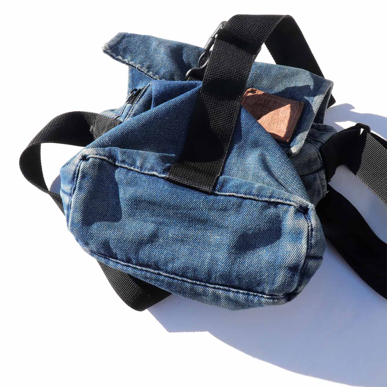 ブルーデニムボディ、レザーパッチ付き。