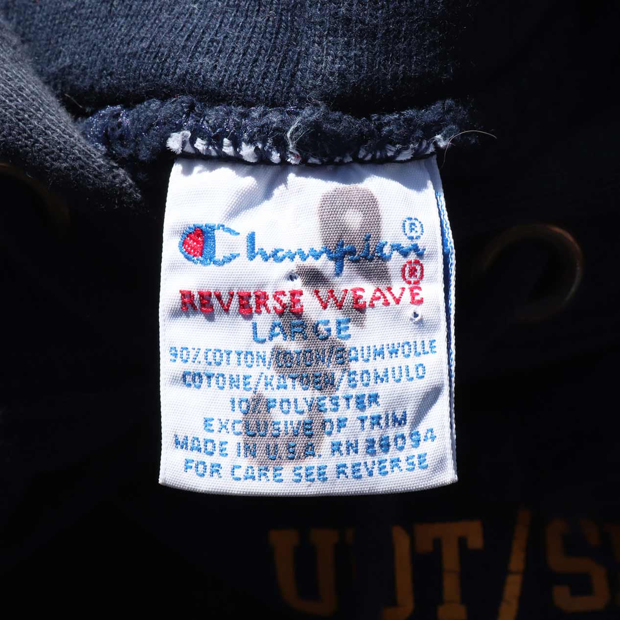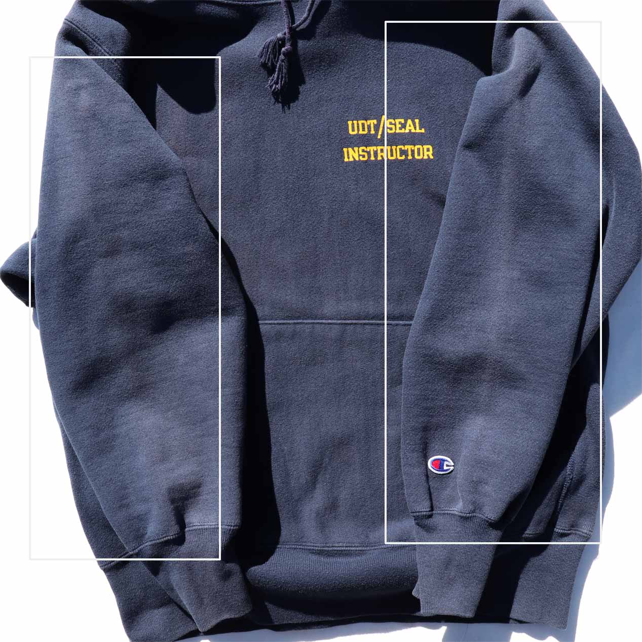 MODEL : CHAMPION “UDT/SEAL INSTRUCTOR” Reverse Weave Parka MADE IN : U.S.A. AGE : 90's SIZE : L COLOR : ネイビー MATERIAL : コットン 90% ポリエステル 10% COMMENT : 90年代、チャンピオンのリバースウィーブパーカーです。