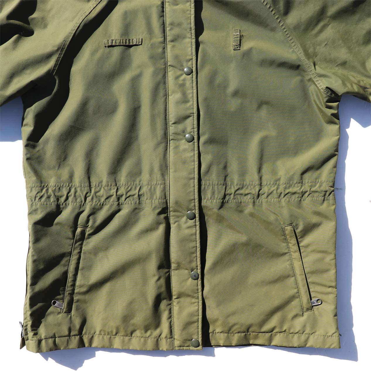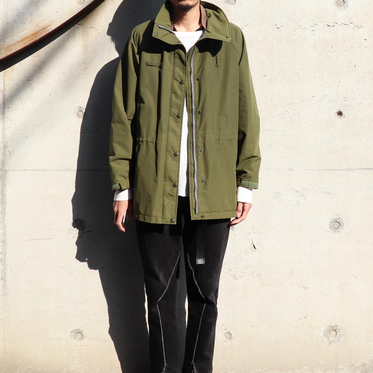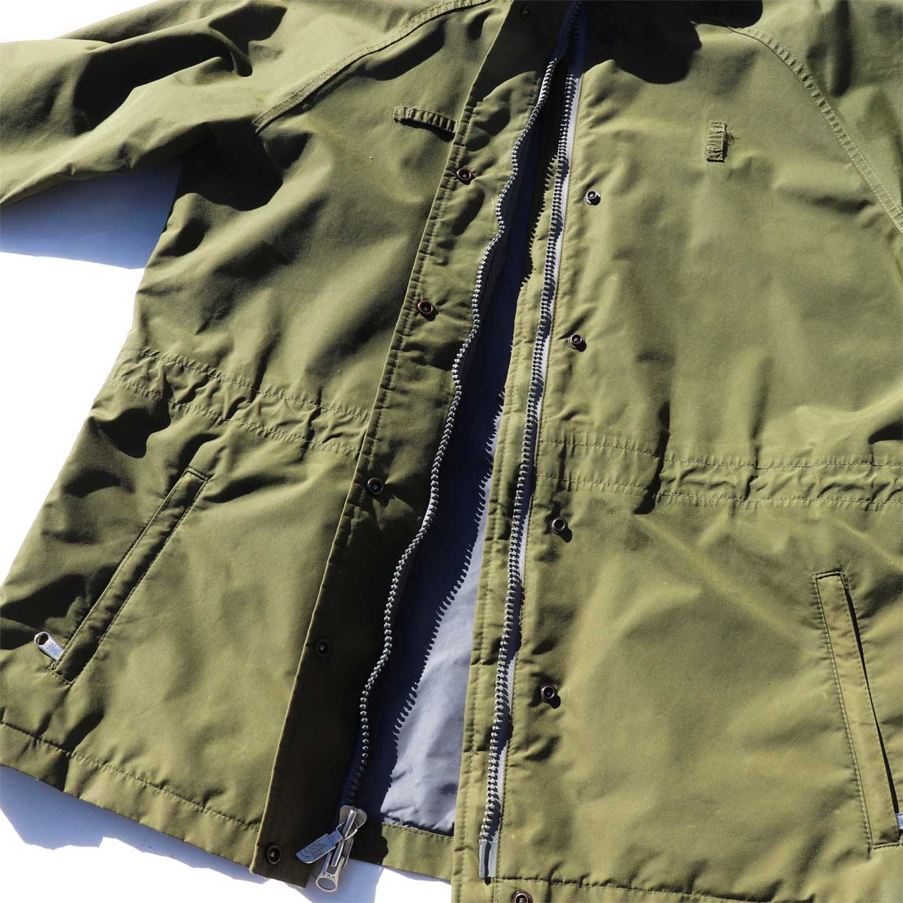 フロントポケット×2、内ポケット×2、フロントWジップ+ドットボタン留め、サイドジップ、ラグランスリーブ、袖口ベルクロバンド留め、フード欠損。