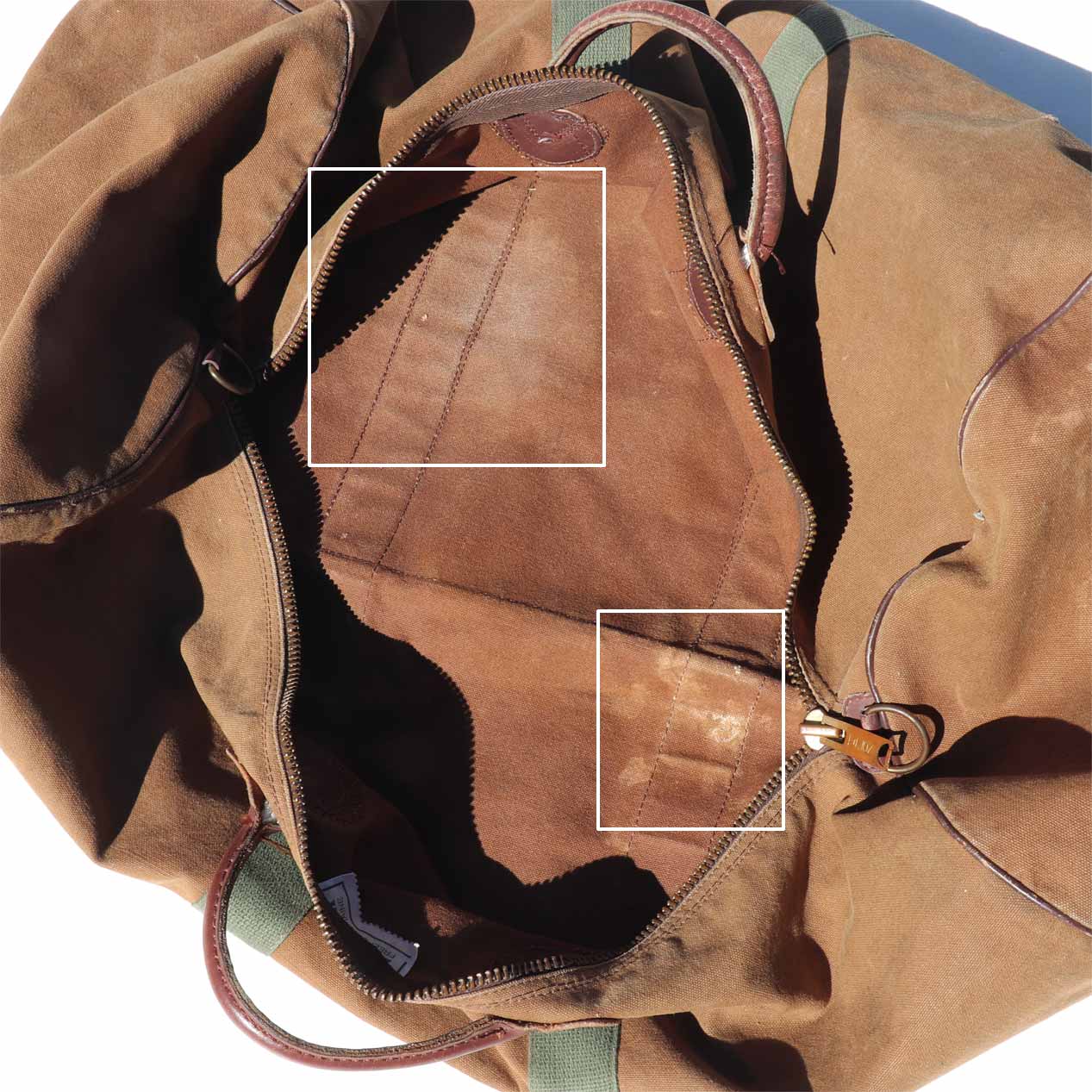 ・全体 : 使用感、ボディ外面・内面・底レザーに薄い汚れ、ボディ外面に一部破れ・穴、レザートリムにスレ