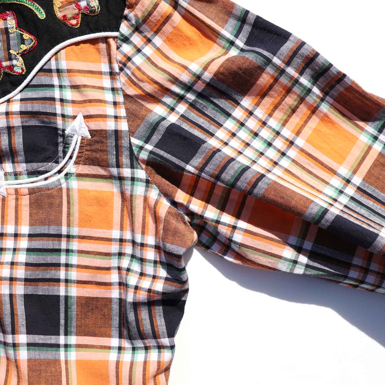 鮮やかなチェック生地にブラックレーヨン切替が映える一枚。