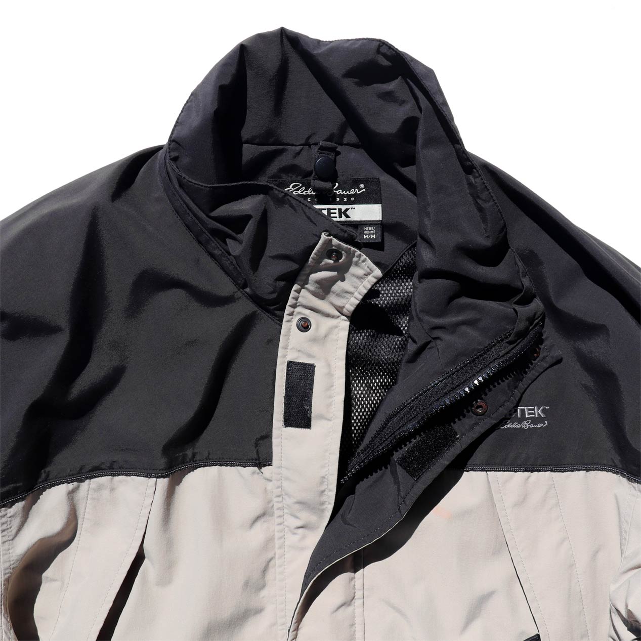 MODEL : EBTEK EDDIE BAUER WEATHEREDGE Nylon Mountain Jacket MADE IN : China AGE : 90's SIZE : M COLOR : サンド/ブラック MATERIAL : 表地・袖裏 : ナイロン 100% / 裏地 : ポリエステル 100% COMMENT : 90年代 EBテック エディーバウアー