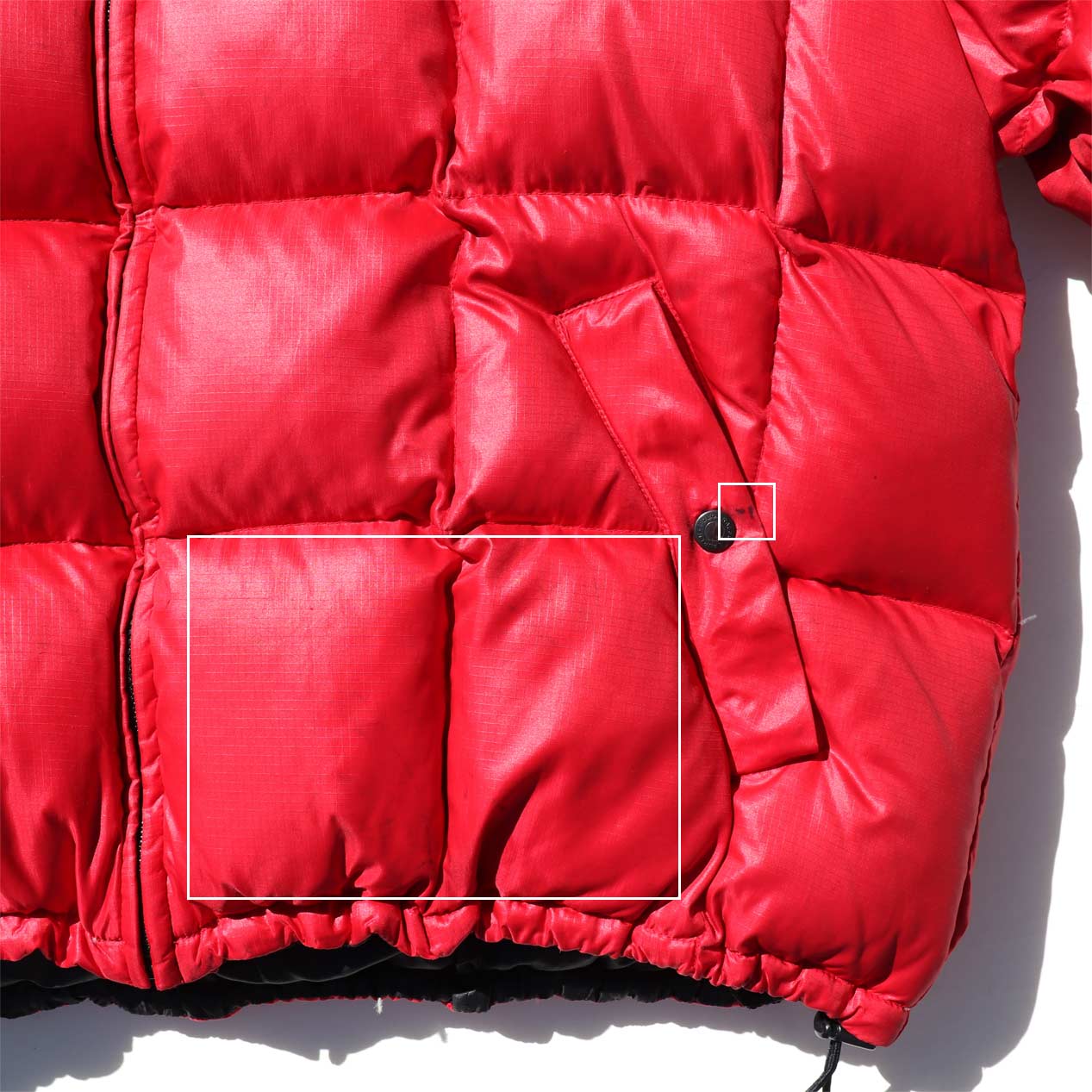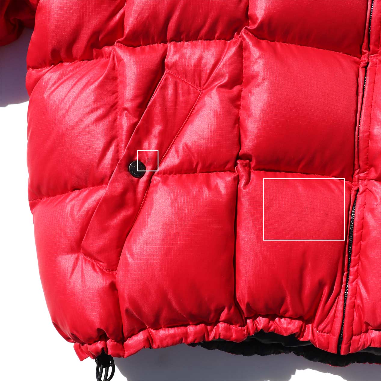 ・フロント、袖 : 左胸、両ポケット、両裾、左袖脇下付近に汚れ