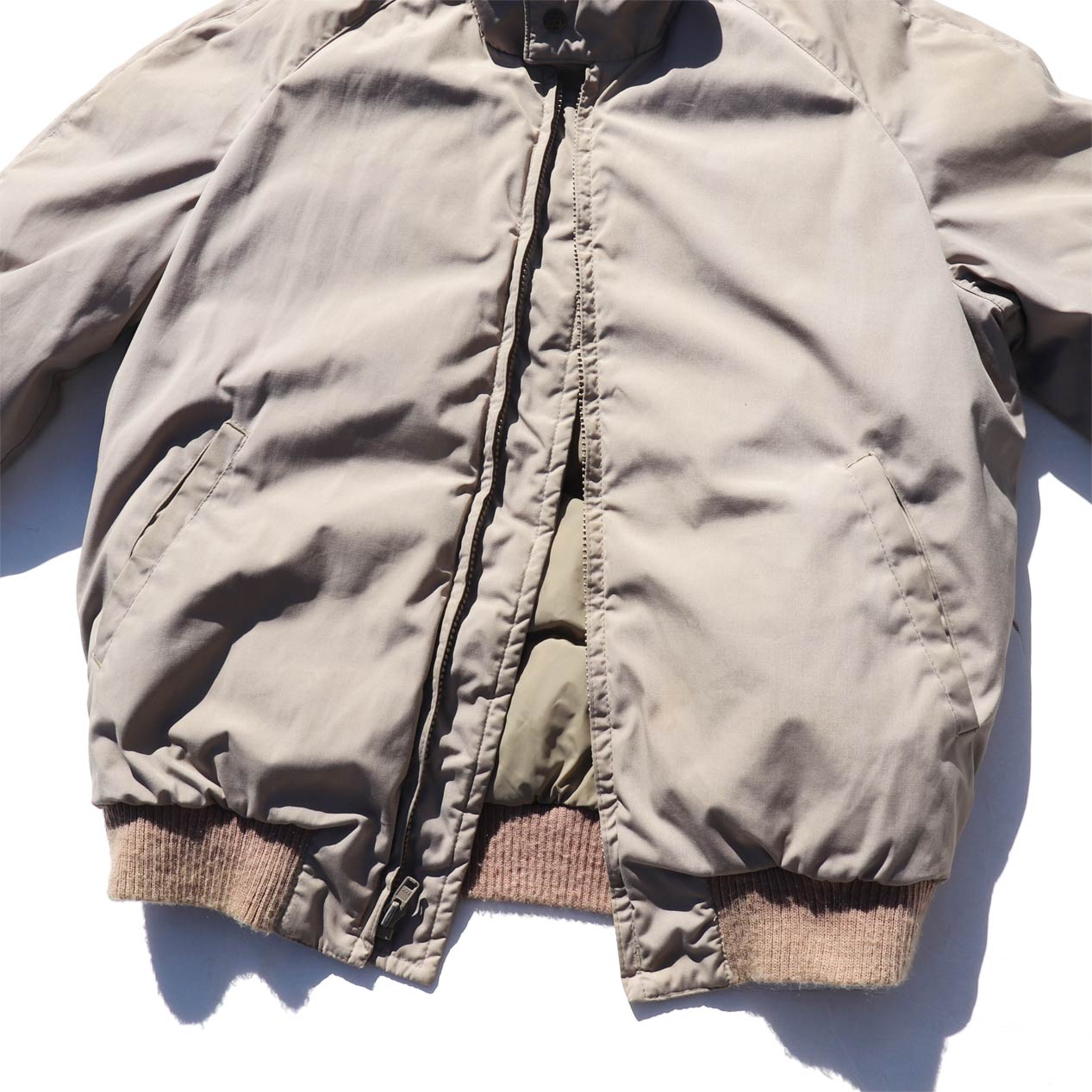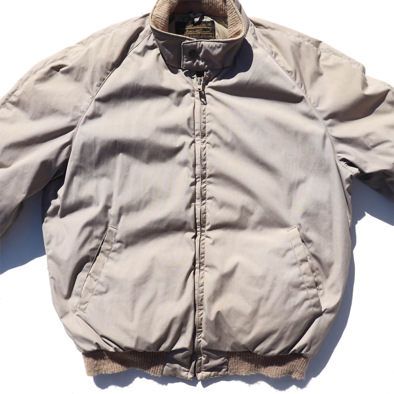 MODEL : EDDIE BAUER Stand Collar All Purpose Down Jacket MADE IN : U.S.A. AGE : 80's SIZE : M COLOR : カーキ MATERIAL : 表地 : ポリエステル 65% コットン 35% / 裏地 : ナイロン 100% / フィル : グースダウン COMMENT : 80年代 エディーバウアー スタンドカラーオールパーパス