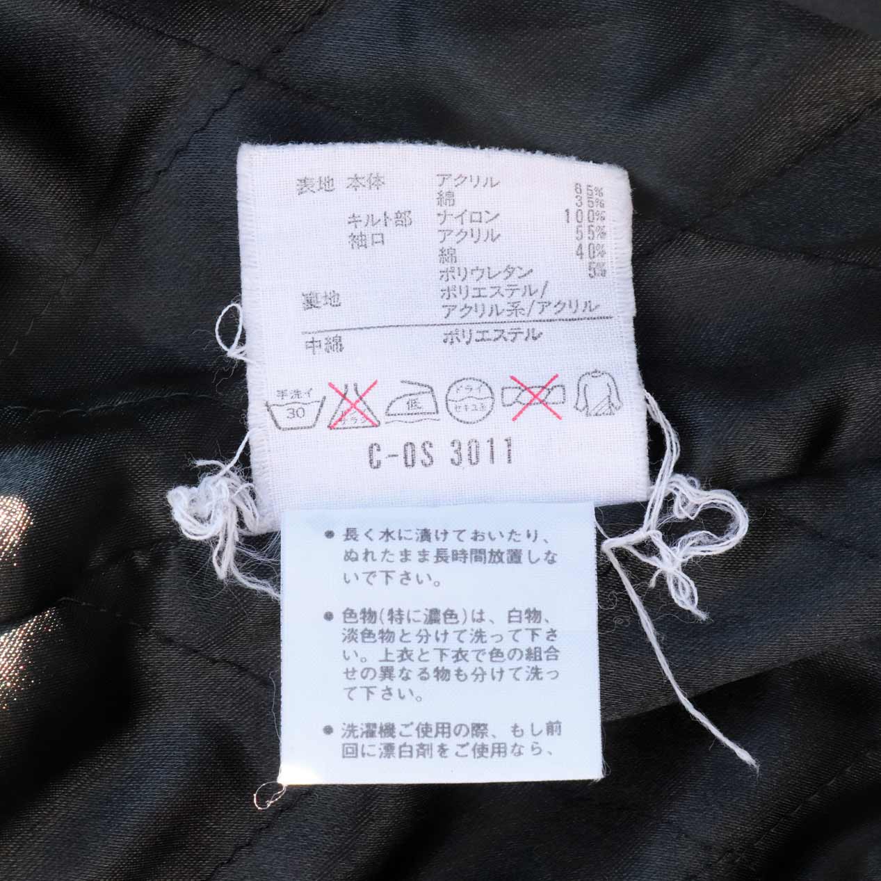 MATERIAL : 表地 : アクリル 65% コットン 35% / キルト部 : ナイロン 100% / 裏地・中綿 : ポリエステル