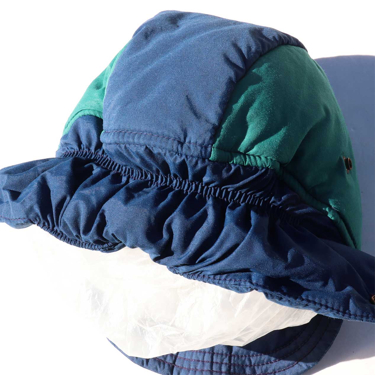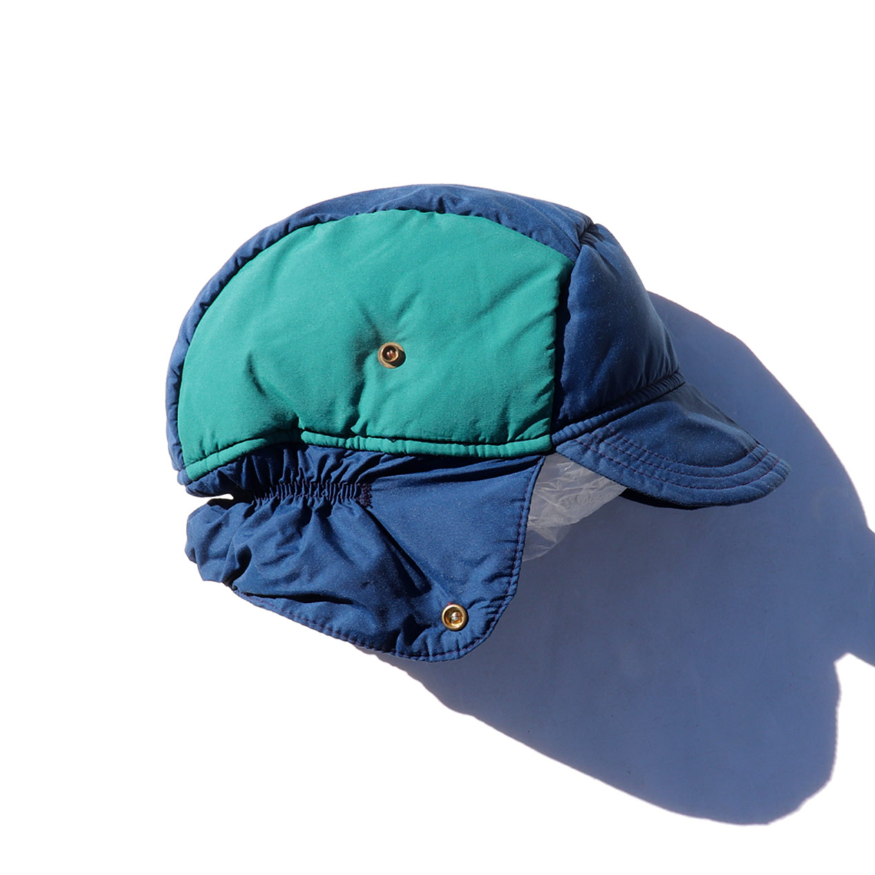 MODEL : REI Earflap Padded Nylon Cap MADE IN : U.S.A. AGE : 80's SIZE : --- (XL相当) COLOR : ブルー/エメラルド MATERIAL : 表地 : ナイロン 100% / フィル : ポリエステル COMMENT : 80年代 アールイーアイ