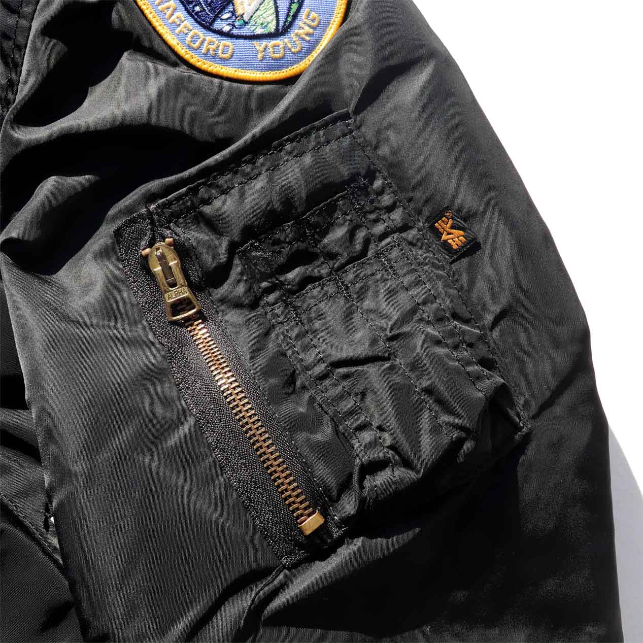 MODEL : ALPHA INDUSTRIES “FROM THE EARTH TO THE MOON” MA-1 Promo Jacket MADE IN : U.S.A. AGE : 90's SIZE : XL (裏面襟下にはLサイズタグあり) COLOR : ブラック MATERIAL : 表地・裏地 : ナイロン 100% / フィル : ポリエステル 100% COMMENT : 90年代 アルファインダストリーズ MA-1
