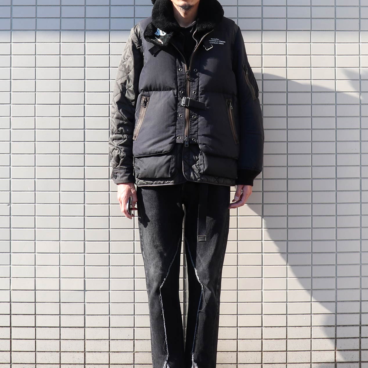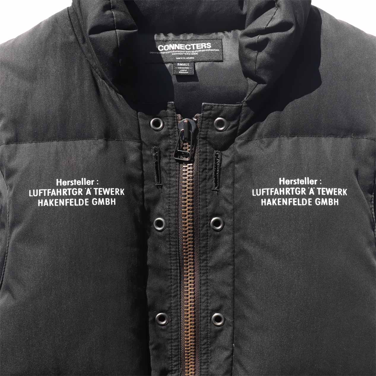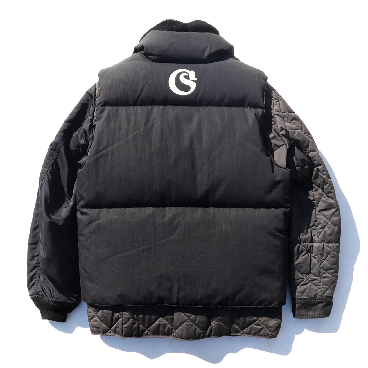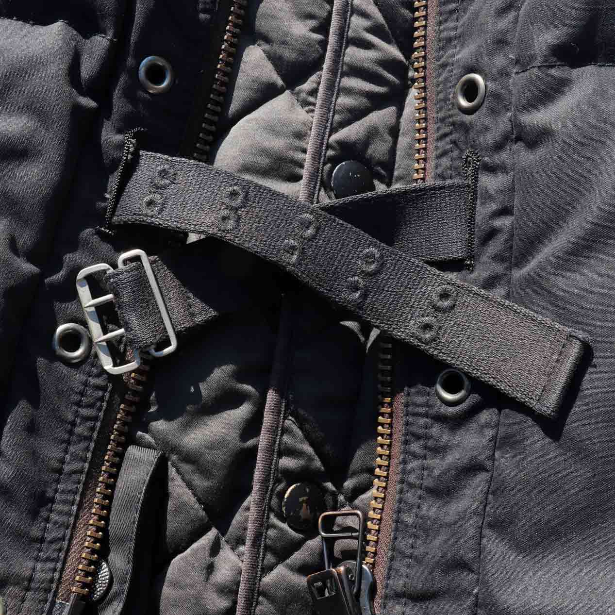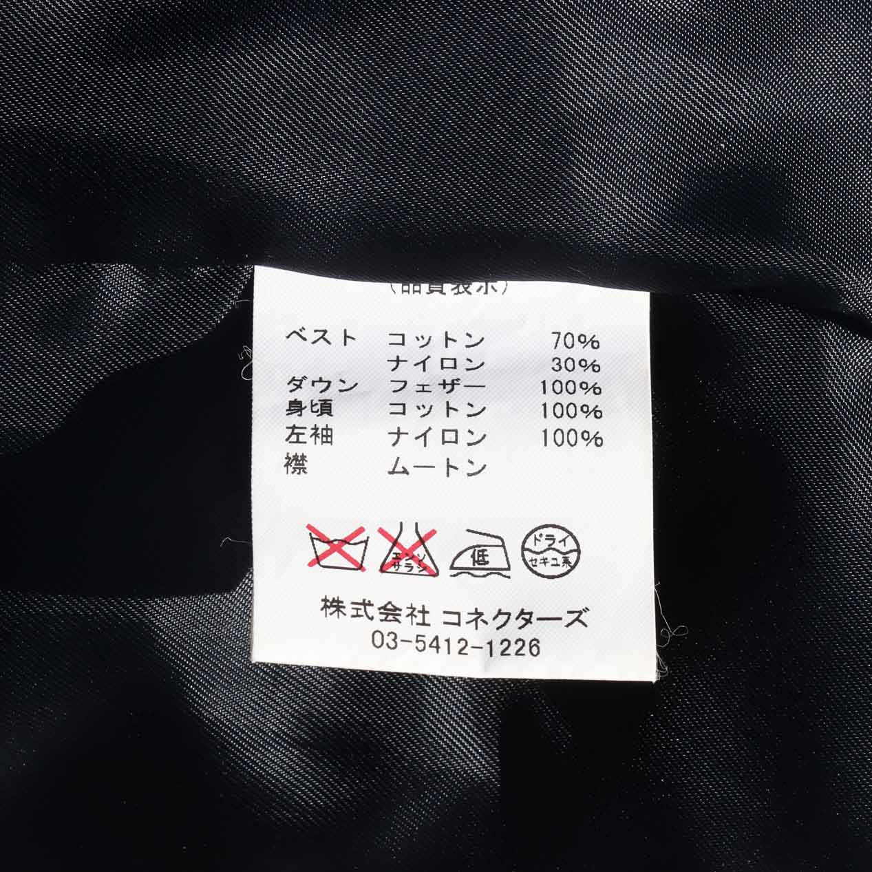 MATERIAL : ベスト表地 : コットン 70% ナイロン 30% / フィル : ダウン&フェザー / ジャケット表地 : コットン 100% / 左袖 : ナイロン 100% / 襟 : ムートン