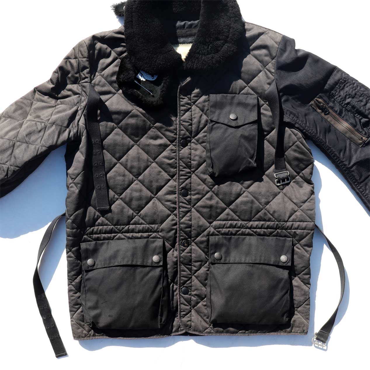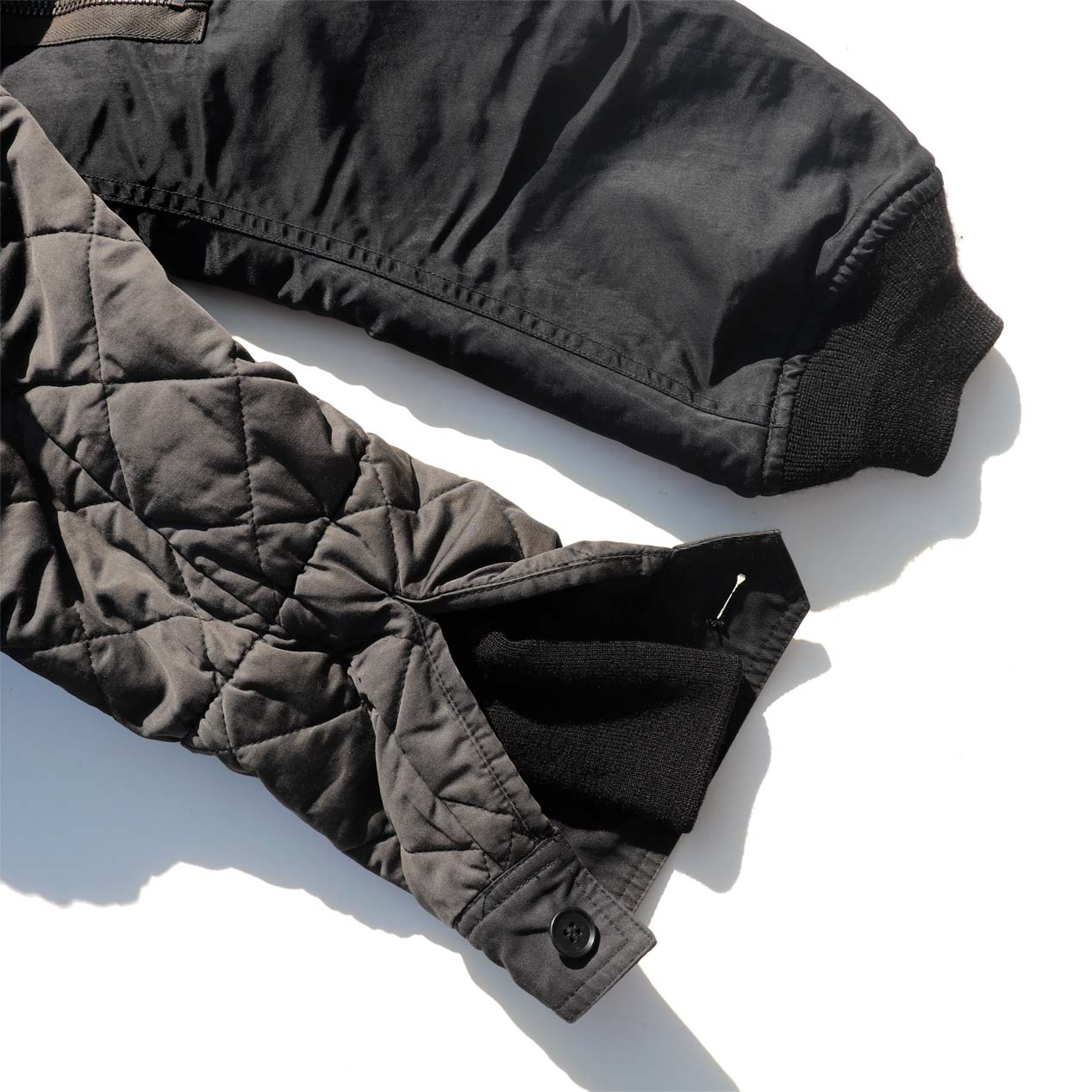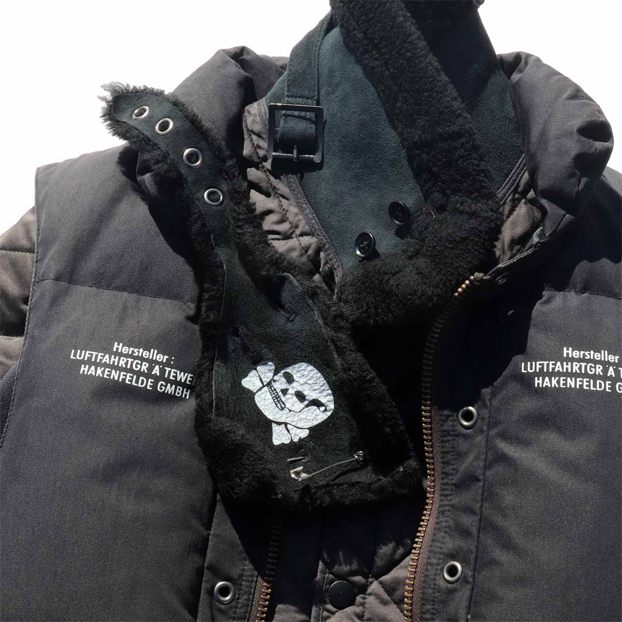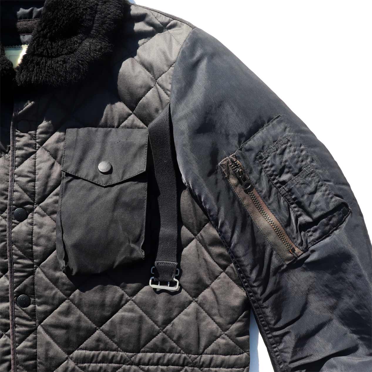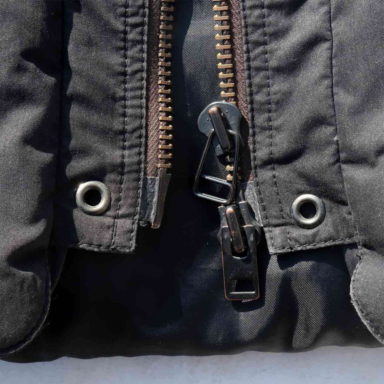 MATERIAL : ベスト表地 : コットン 70% ナイロン 30% / フィル : ダウン&フェザー / ジャケット表地 : コットン 100% / 左袖 : ナイロン 100% / 襟 : ムートン