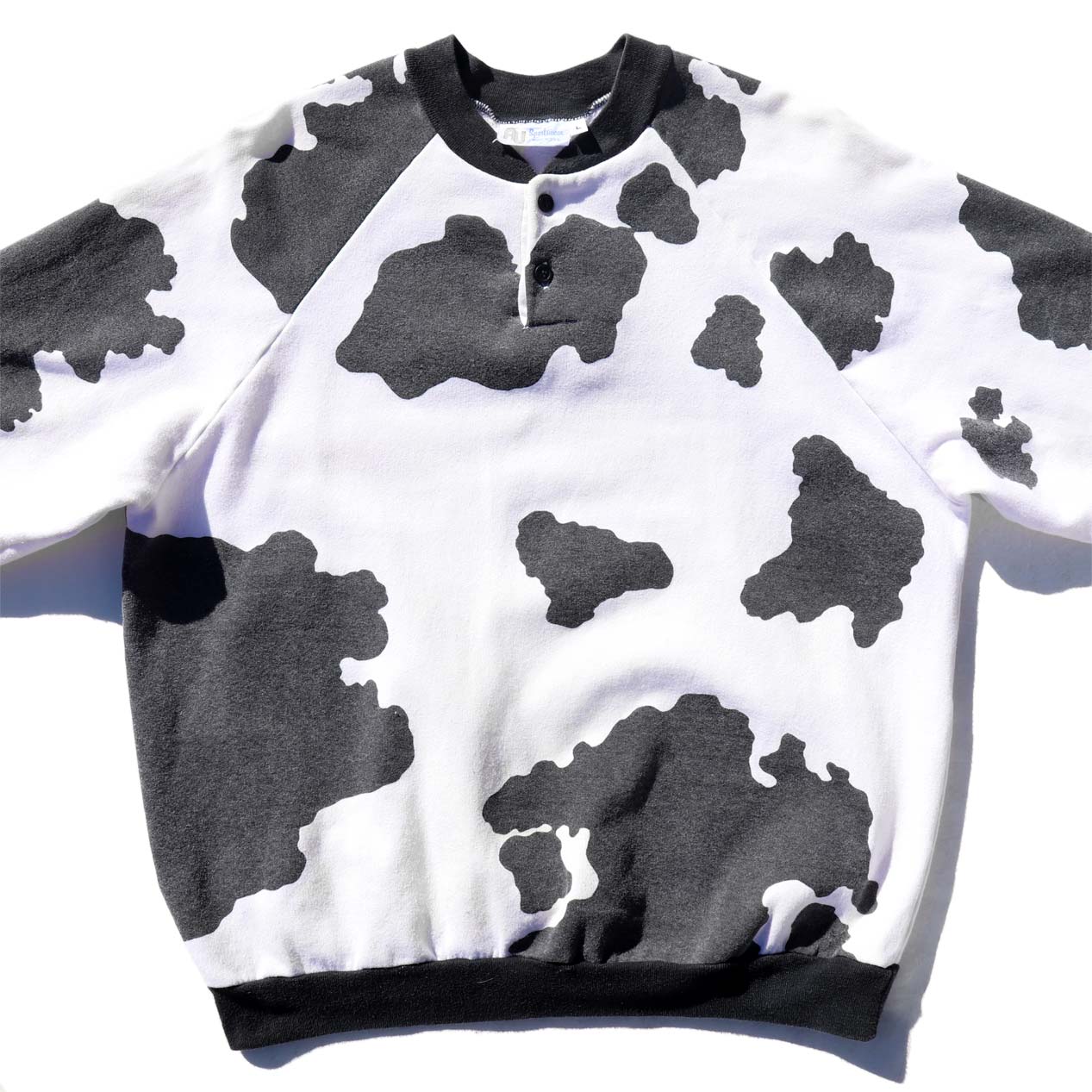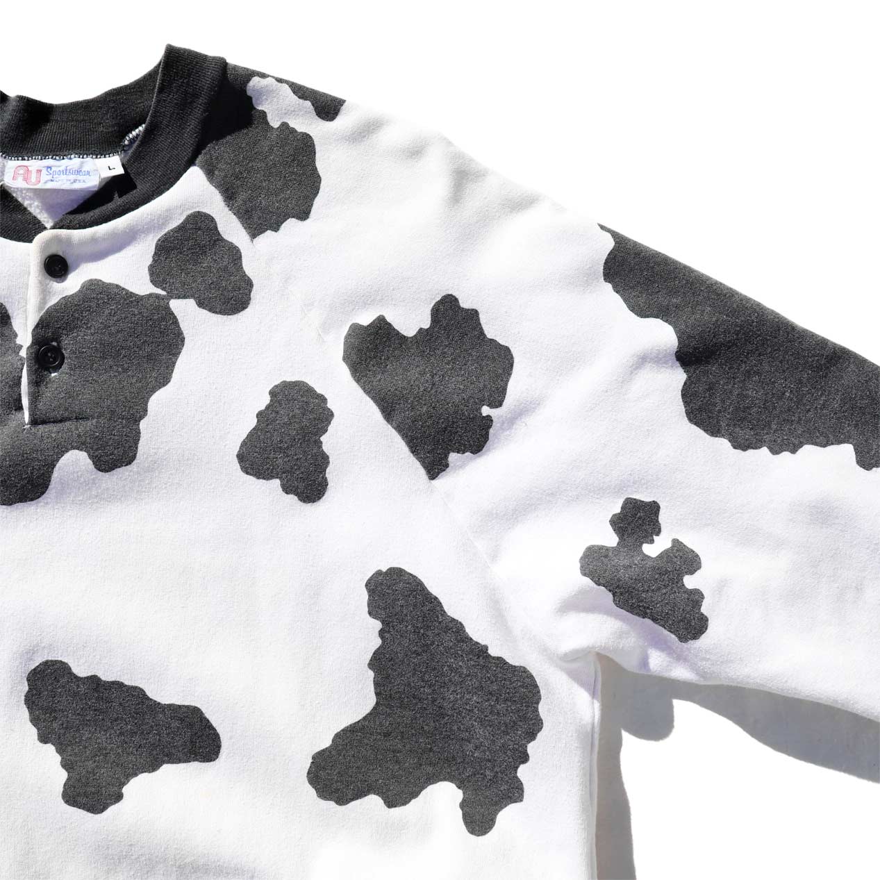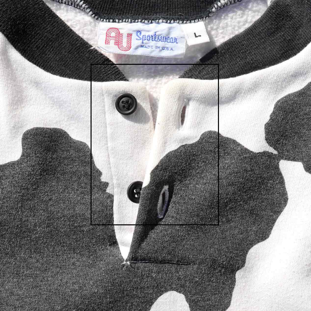 MODEL : AU SPORTSWEAR Holstein Patterned Sweatshirt MADE IN : U.S.A. AGE : 80's SIZE : L COLOR : ホワイト/ブラック MATERIAL : --- (おそらくコットン/ポリエステル) COMMENT : 80年代 AUスポーツウェア