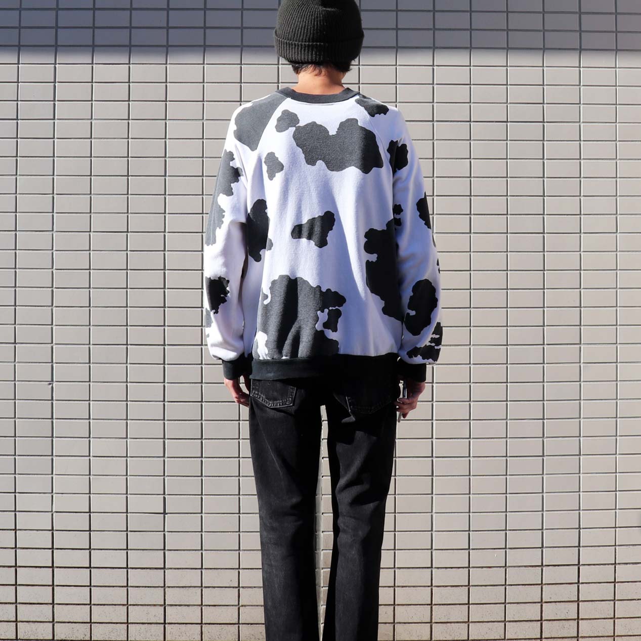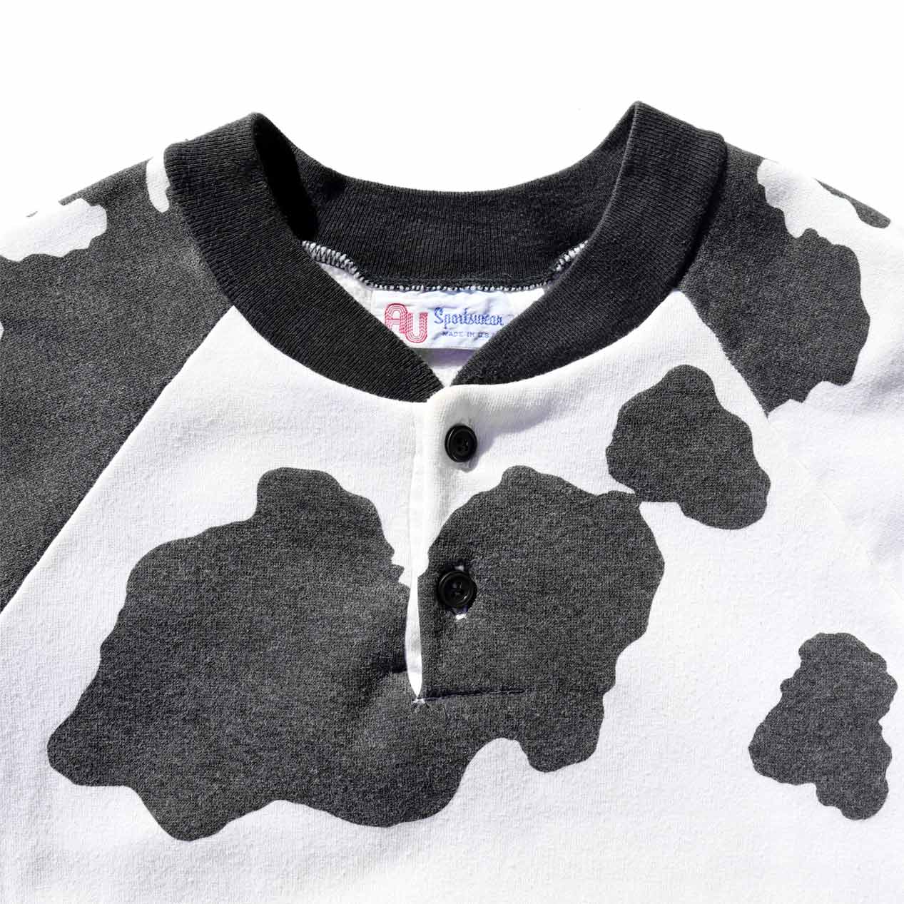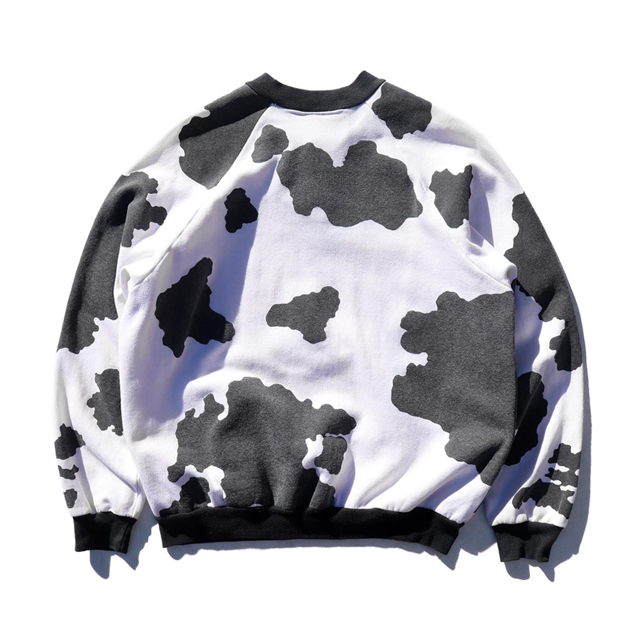 MODEL : AU SPORTSWEAR Holstein Patterned Sweatshirt MADE IN : U.S.A. AGE : 80's SIZE : L COLOR : ホワイト/ブラック MATERIAL : --- (おそらくコットン/ポリエステル) COMMENT : 80年代 AUスポーツウェア