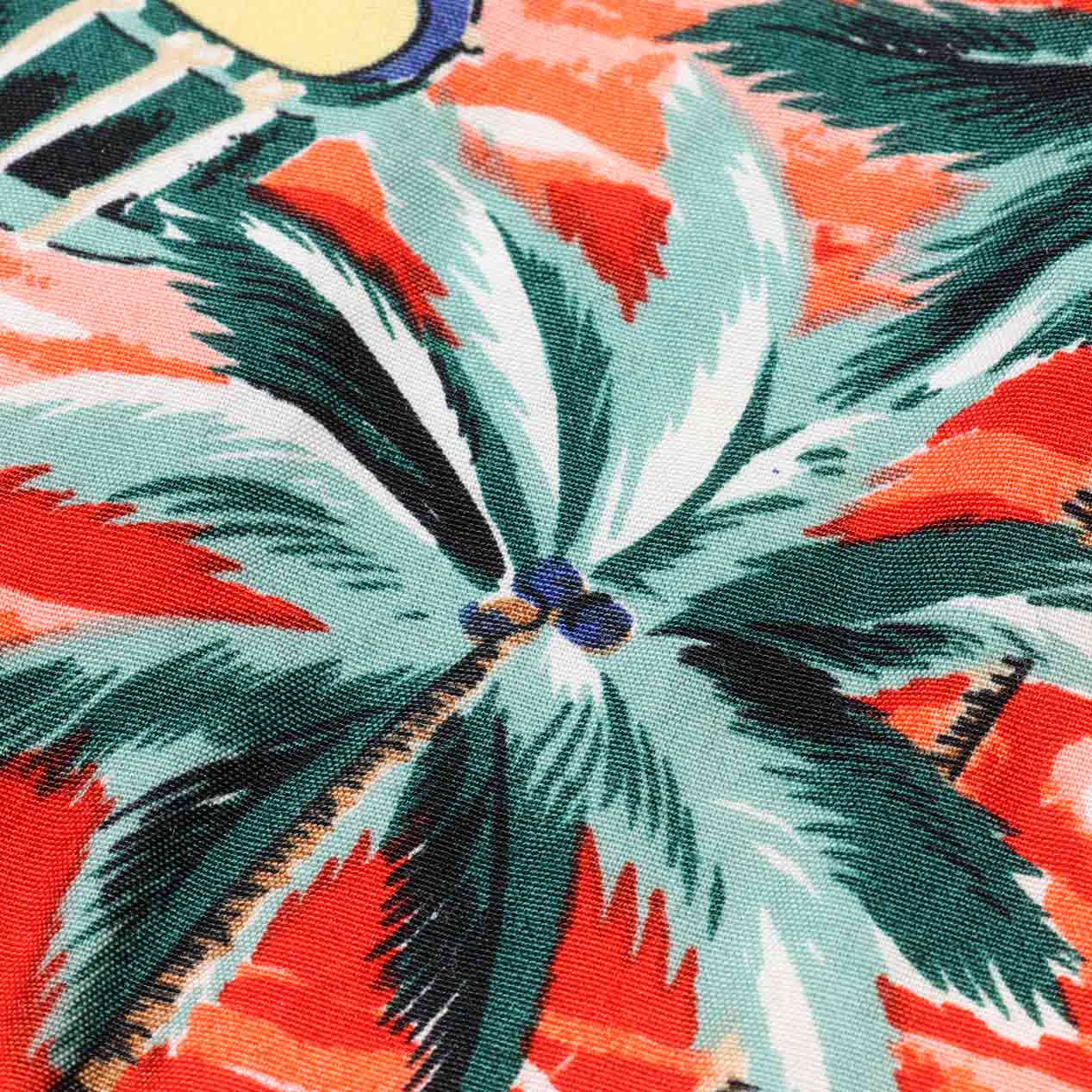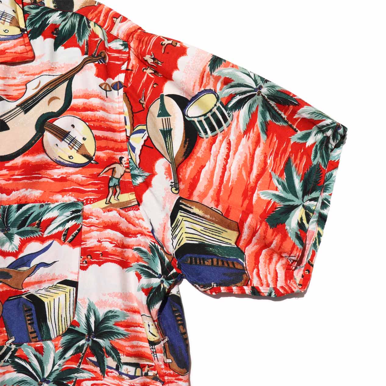 様々な楽器やヤシの木モチーフのオールオーバーパターン。