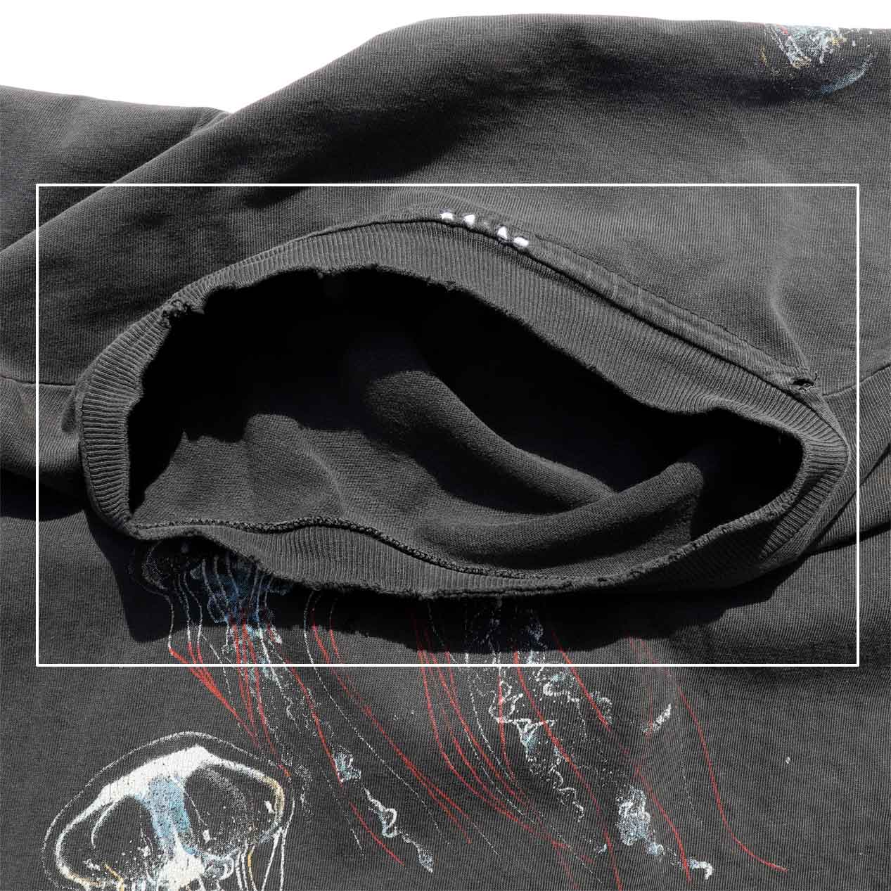 ・全体: 着用感、強い色褪せ、首リブ端周囲にスレ破れ