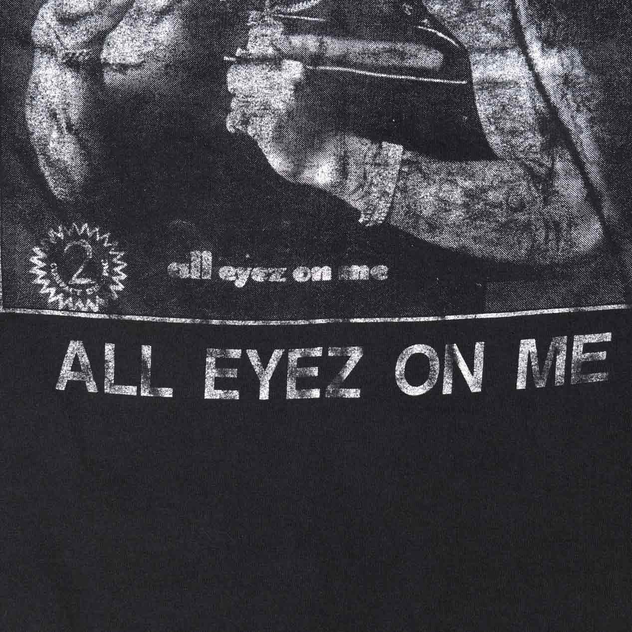 MODEL : 2PAC "ALL EYEZ ON ME" プリントTシャツ MANUFACTURE : --- AGE : 90’s SIZE : --- (XL相当) COLOR : ブラック MATERIAL : --- (おそらくコットン 100%) COMMENT : 90年代、2PACのプリントTシャツです。