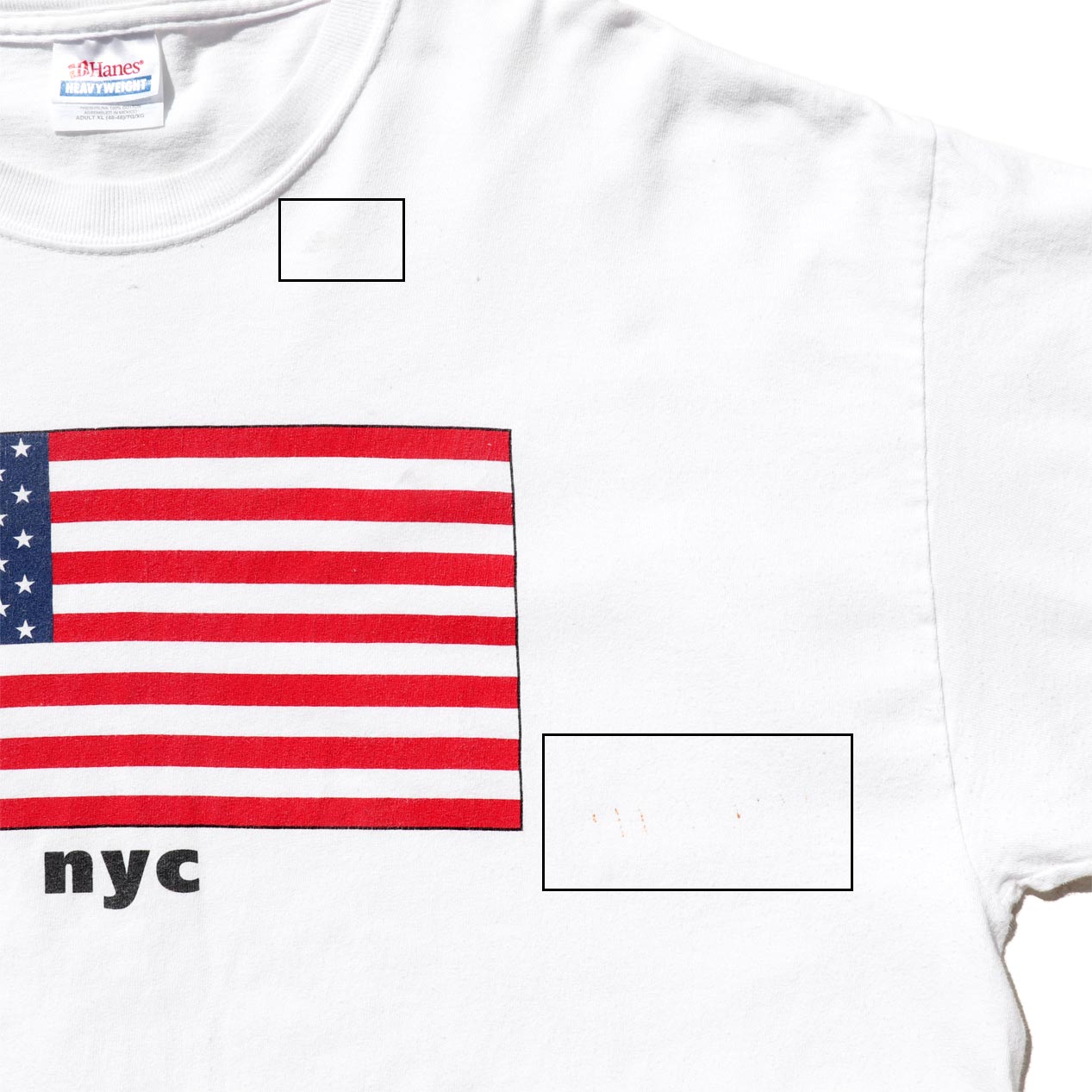 ・フロント: 襟下、胸部、裾付近に薄い汚れ