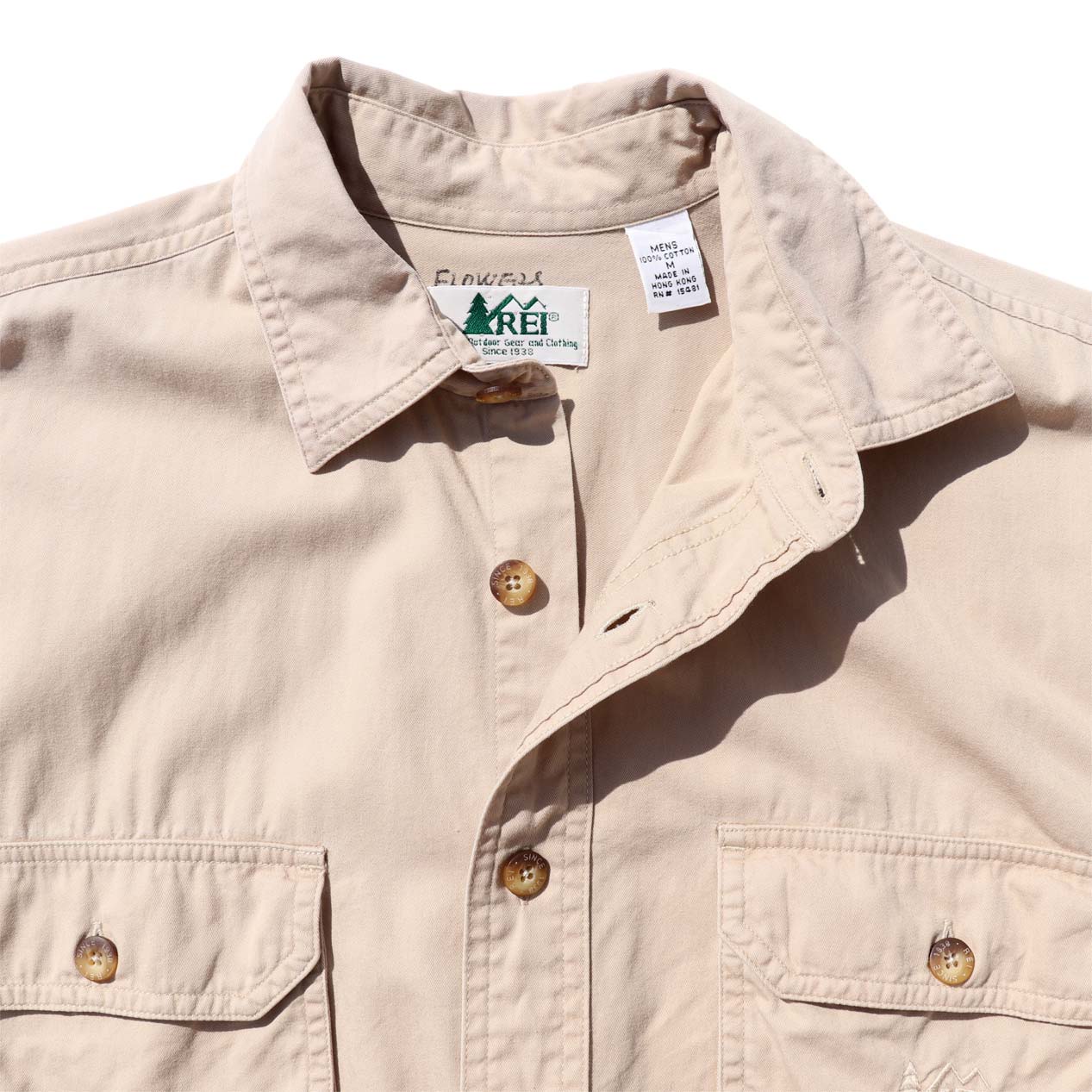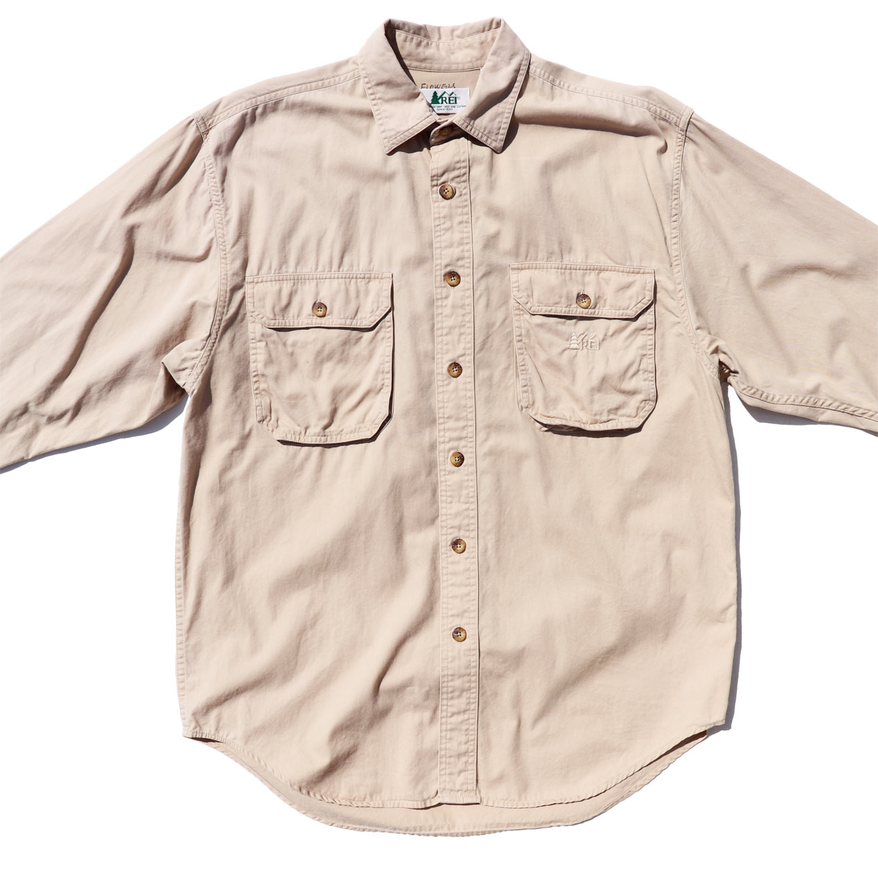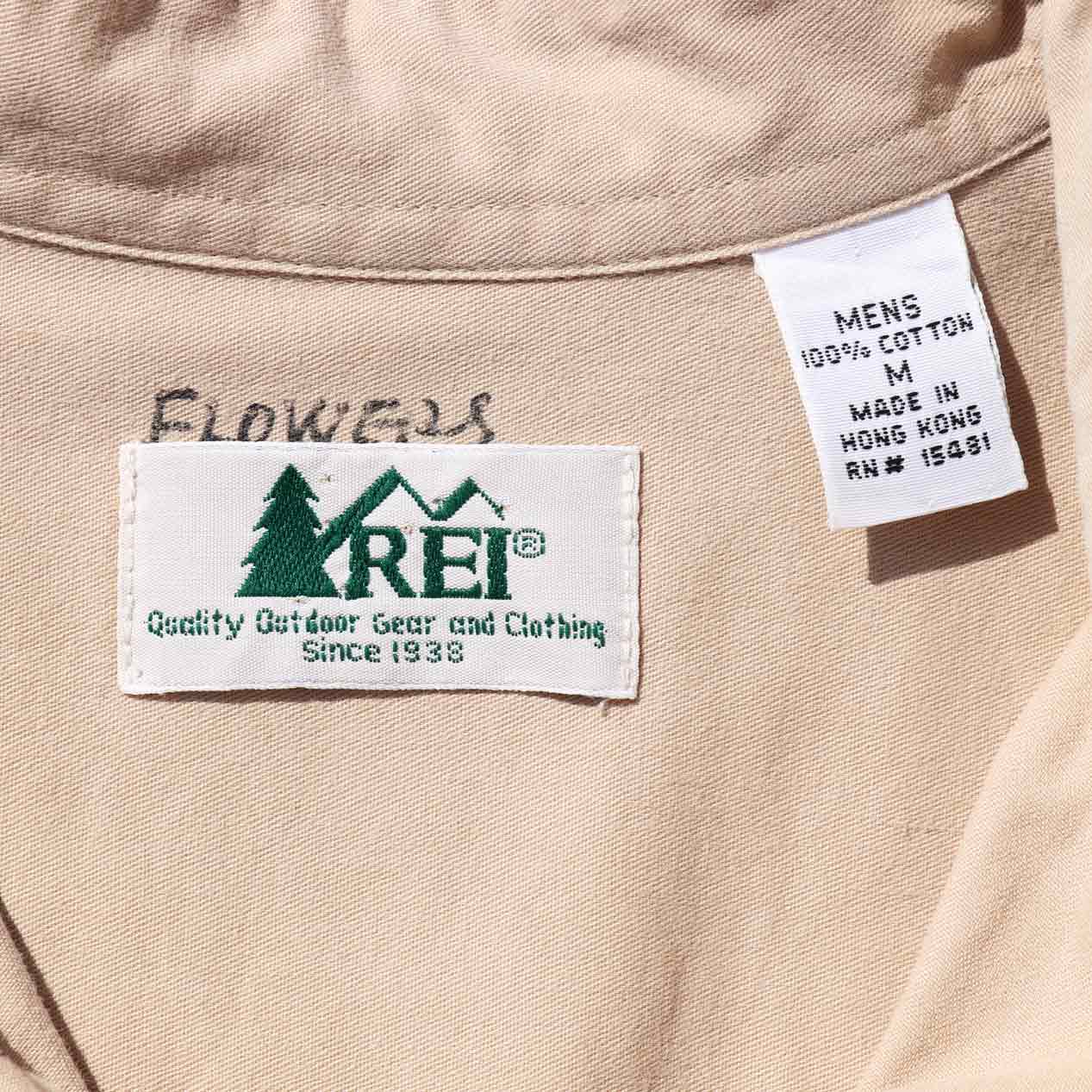 MODEL: REI Cotton Poplin L/S Shirt MADE IN: Hong Kong AGE: 80's SIZE: M COLOR: カーキ MATERIAL: コットン 100% COMMENT: 80年代 アールイーアイ